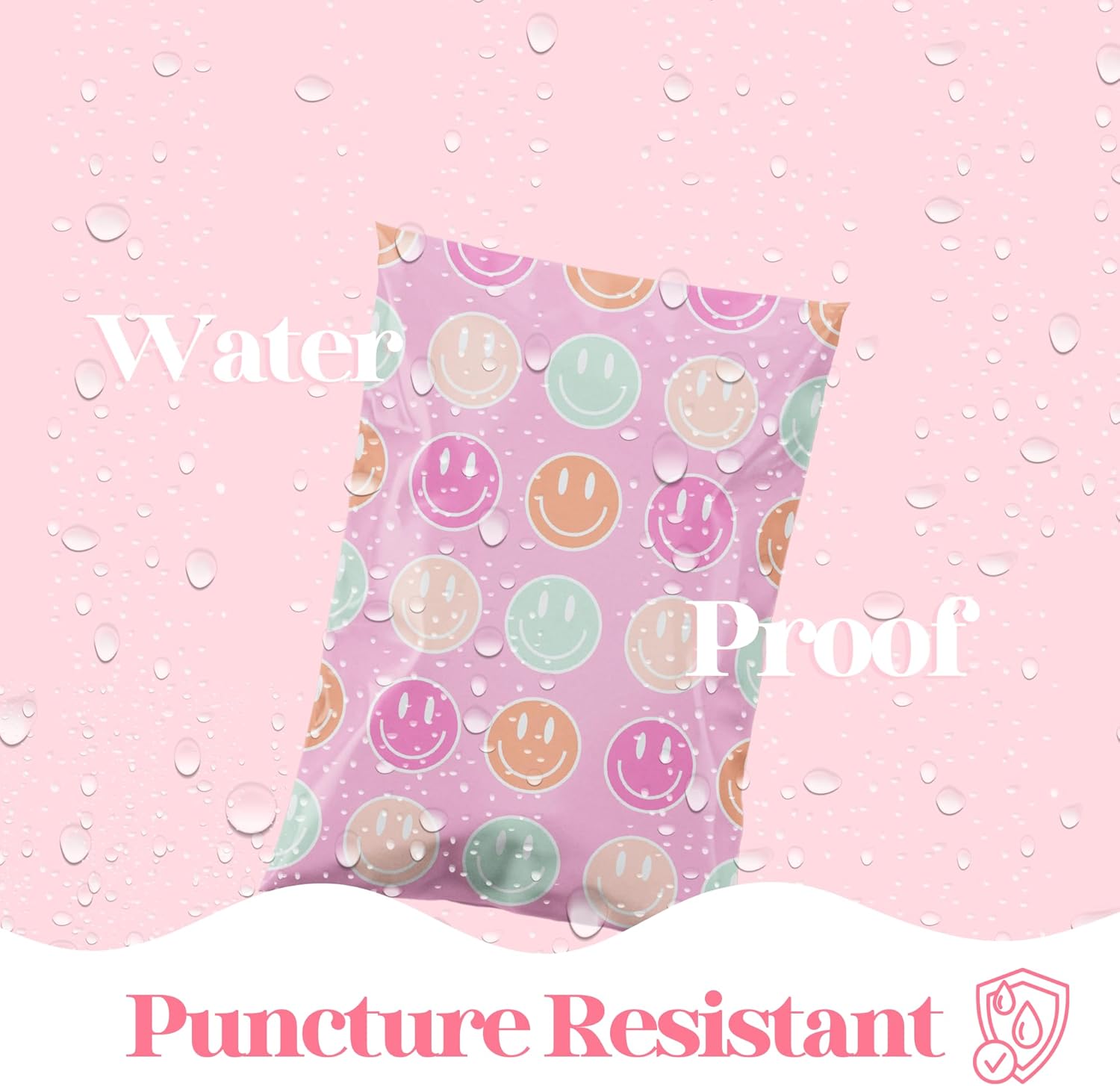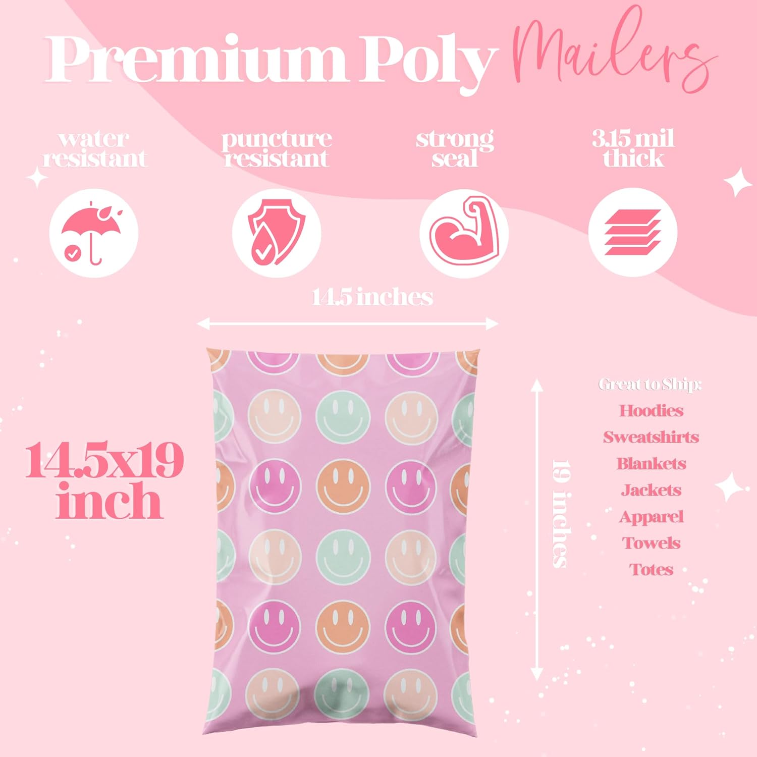 14.5x19 Designer Poly Mailer 100 Pack Heavy Duty Waterproof Self Seal Shipping Bags for Small Business Large Mailing Envelopes Bulk Tear Resistant Cute Packaging Smiley Face