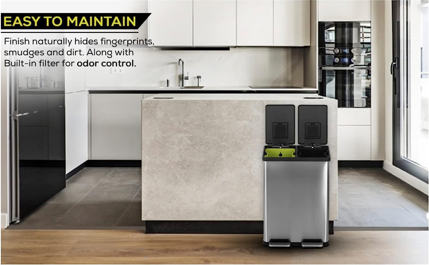 - HANDS-FREE USE: The stainless-steel foot pedal stands up to daily use and removes the need to touch the lid during waste or recycling disposal to keep hands clean.
