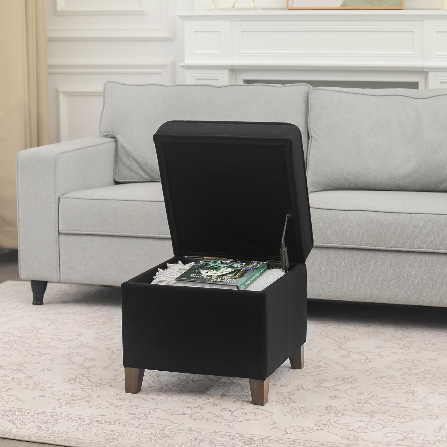 Adeco 17.5" Square Fabric Ottoman with Storage - Upholstered Cotton Linen Foot Rest - Flip Top Footstool with Sturdy Wood Legs, Small Cube Coffee Table Extra Seat for Living Room, Bedroom, Black