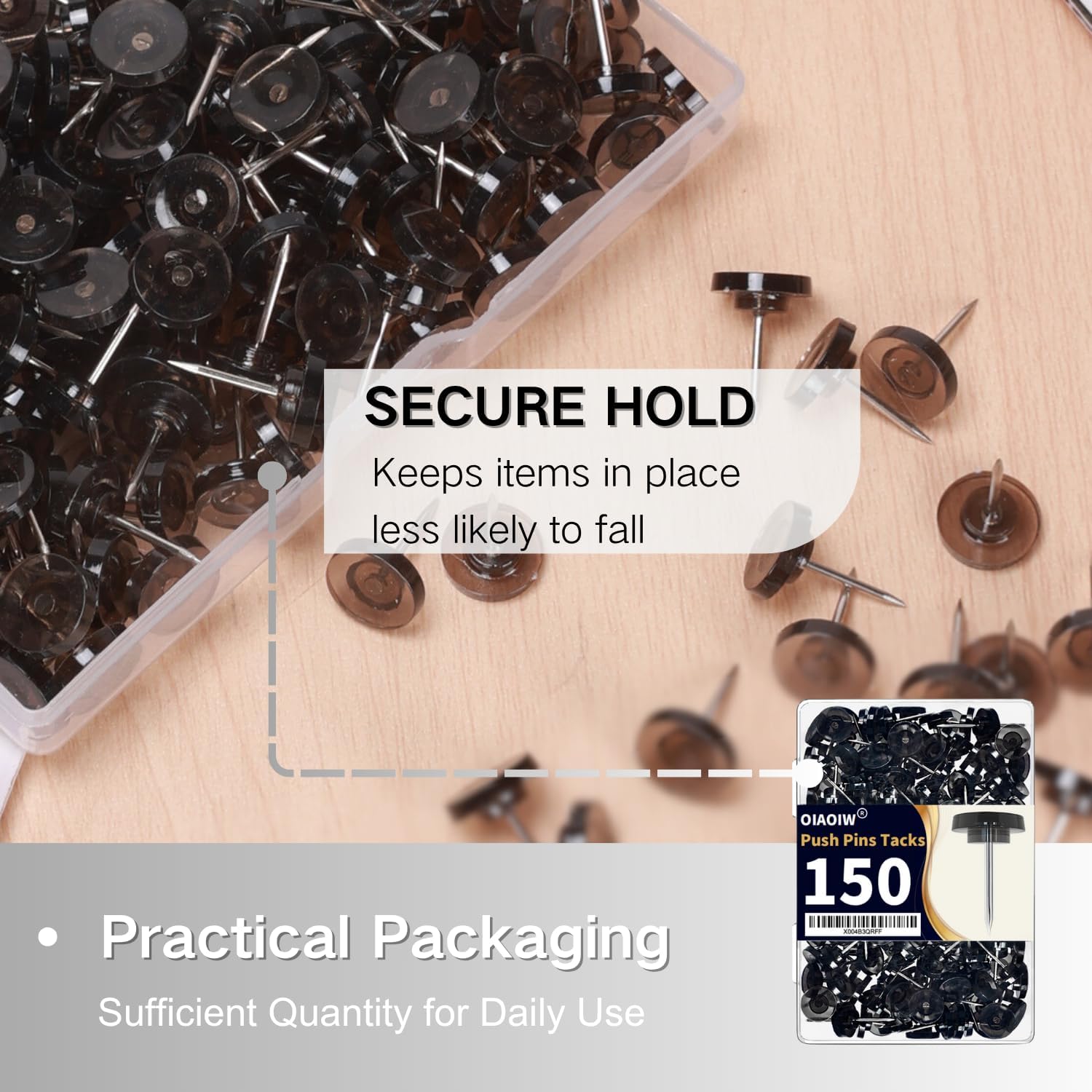 150 PCS Flat Black Push Pins for Wall Clear Thumb Tacks for Walls Flat thumbtacks Push pin for Bulletin Board Shadow Box Display Thumbtack for Cork Board
