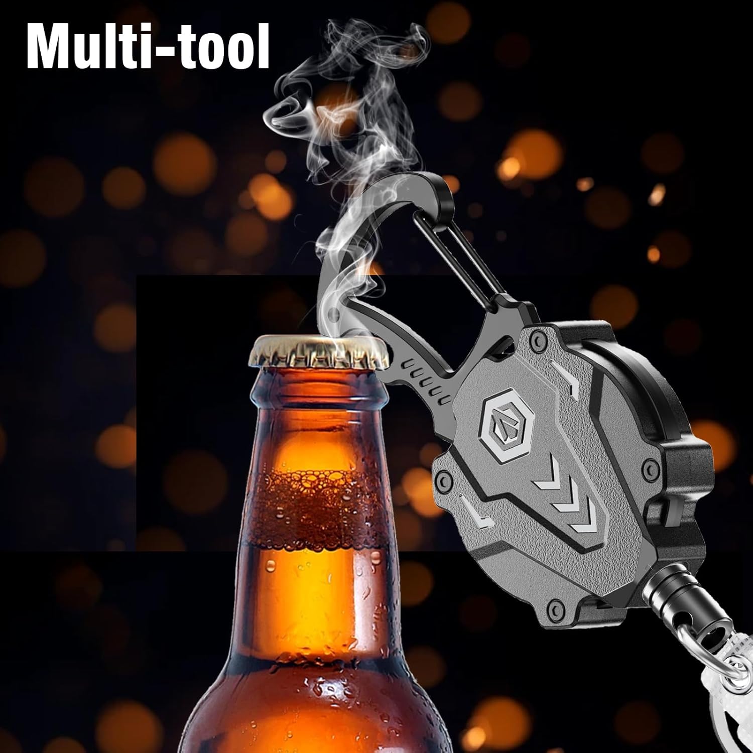 - [Multi-function tool] Cool tactical badge reel with key chain ring and ID badge clip not only can hang work ID name badge holder, keys, gadget buddy accessories, but also can help you open the beer cap smoothly. It can be fixed on belts, backpacks, handbags, outdoor tents. It also makes a great practical present for men, boyfriends, family, friends