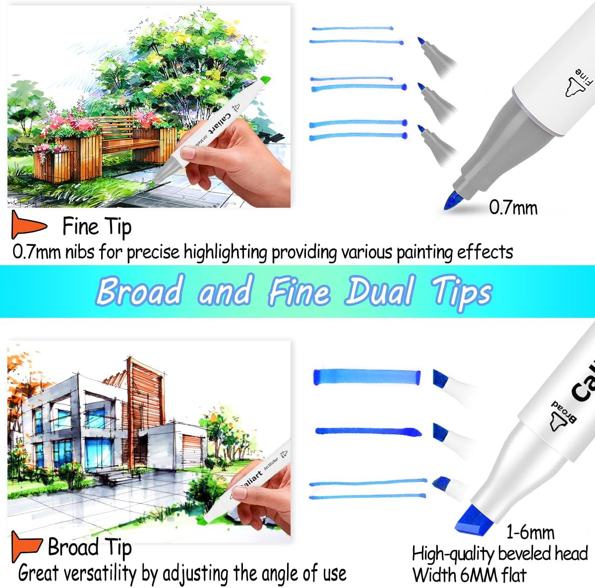 - 🎨 Fine & Chisel Double Tip with Alcohol Markers Brush Tip. Each Fine & Broad Chisel tip markers alcohol based has a double-ended design, providing great versatility. You can choose the brush tip markers for sweeping, details, calligraphic strokes or the broad chisel tip for quickly color in large areas. Alcohol Fine & Broad Chisel tip markers are more durable and do not fray.