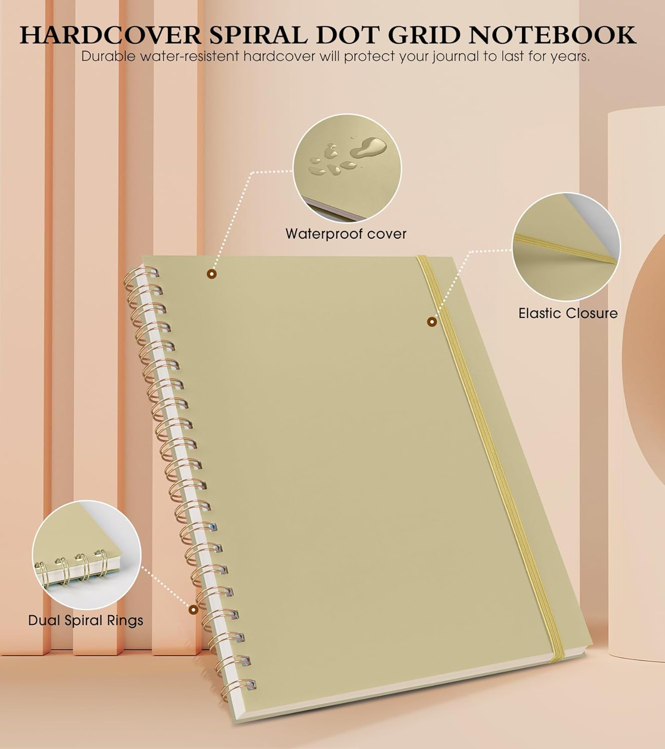 - 【Strong Spiral Metal Twin-Wire】 Our spiral dot grid journal notebook has a sturdy gold-color double wire spiral with easy-to-turn pages and keeps pages attached reliably, while still staying flat when opened, which reading more convenient and taking notes more efficient. Spiral dotted notebook easy to tear-off and fold over, as well as flip the cover back, giving you a better writing experience. Golden spiral bound adds aesthetic matching, it’s the perfect big notebook for journaling.