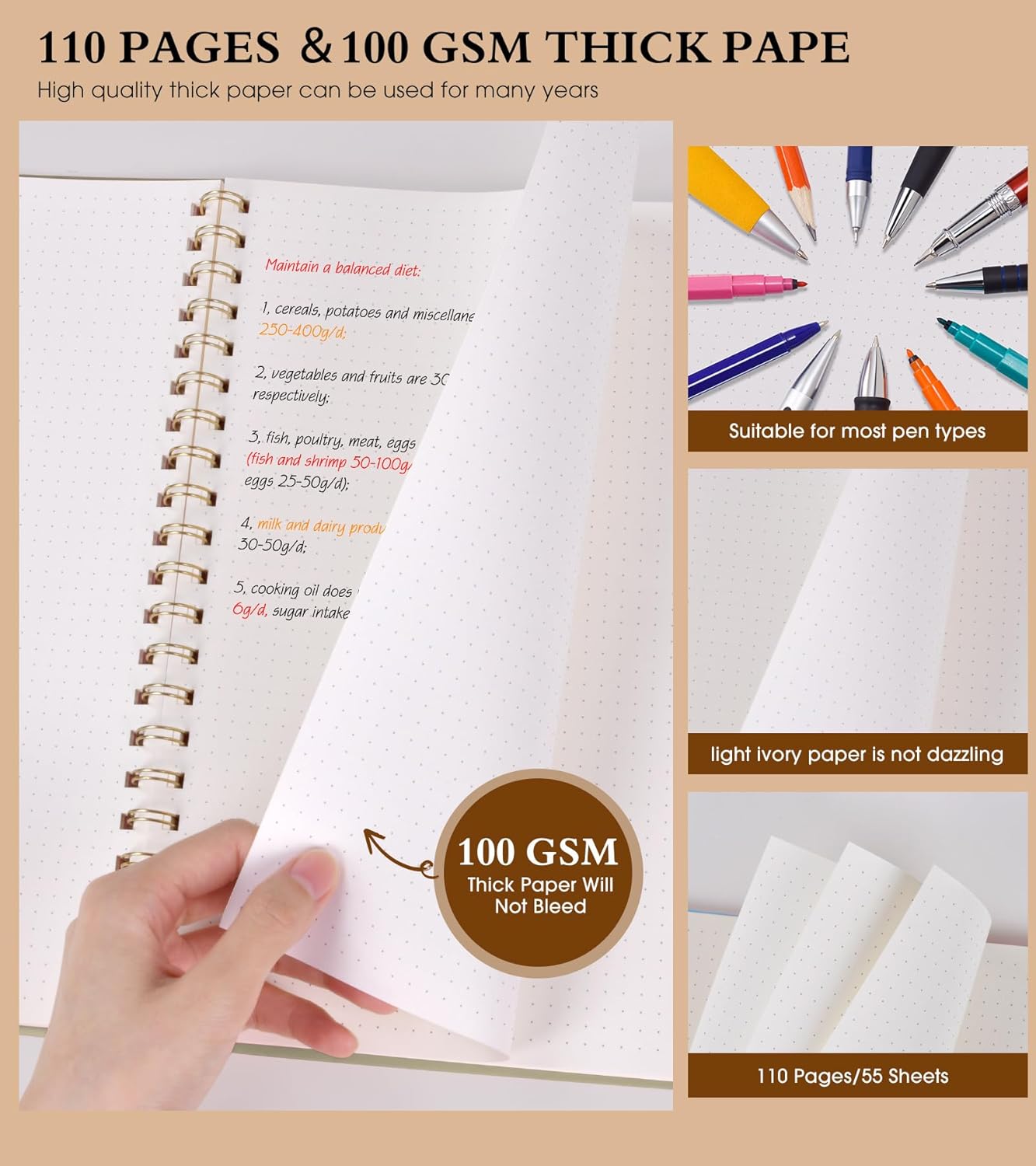 - 【100 GSM Ink-friendly Paper】 Our yellow spiral dot grid notebook pages are very thick, which avoids ink bleeding through and ghosting. Suitable for most pen types, such as ballpoint pens, fountain pens. Each dotted journal 55 sheets/110 pages, offering enough space to write in. Allowing you to write on both sides of every page to maximize your usable space. light ivory paper is not dazzling, let you have a comfortable writing experience.