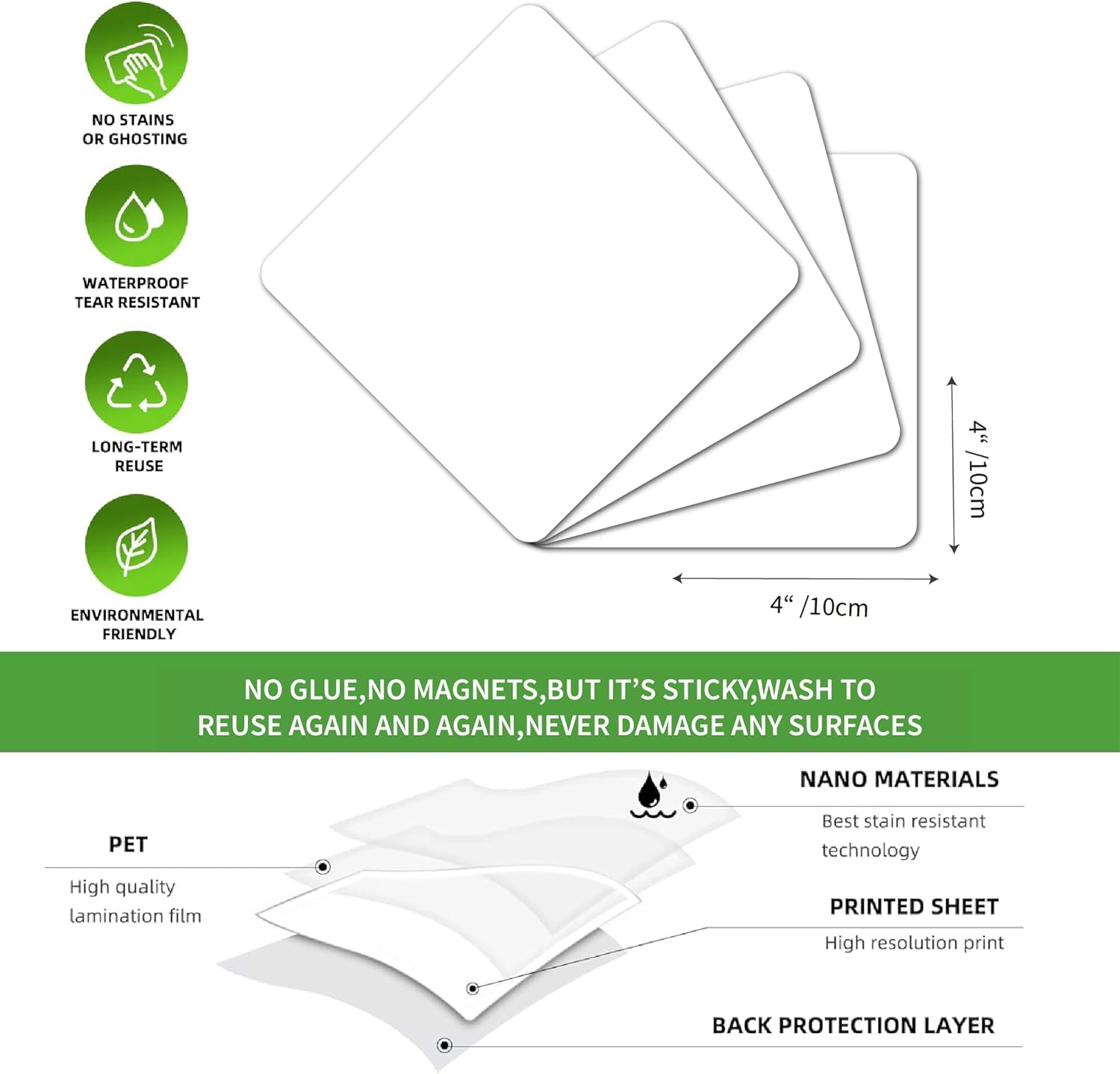 - 💖Really Reusable Dry Erase Sticky Notes - SVNOOC dry erase sticky notes are made of Freon-free Nano Material and dry erase film, can be reused up to10,000 times each. Smooth writing and wipe off easily, no glue, no magnetic but can stick well, heat resistant, microwave safe, just WASH to Renew if get dirt or stickless