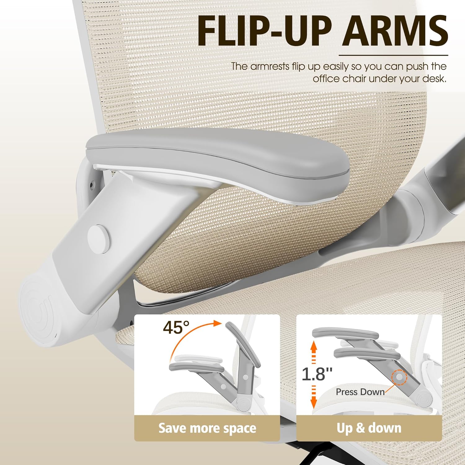 GABRYLLY Ergonomic Office Chair, High Back Home Desk Chair with Headrest, Flip-Up Arms, 90-120° Tilt Lock and Wide Cushion, 400LBS Mesh Chairs for Man Woman, White Task Chair(Beige,GY01WBG)