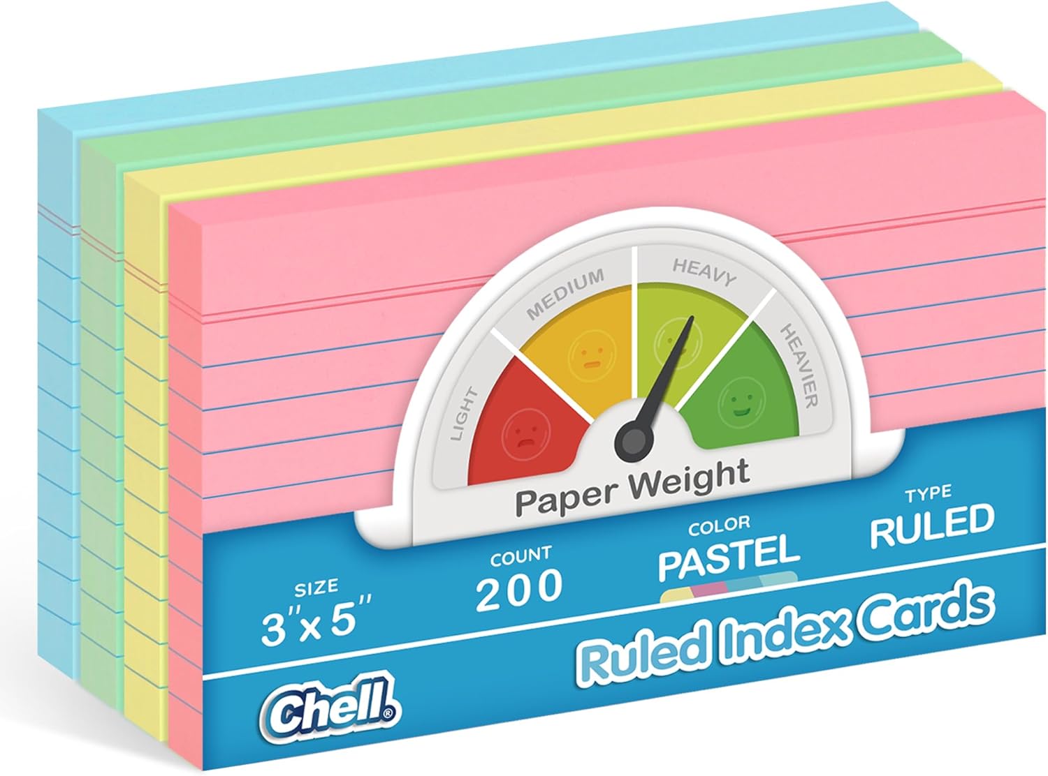 Chell 200 Count Index Cards 3x5 Inch Heavyweight, Ruled Front and Blank Back, 65 lb. Cover Weight, Pastel Colors