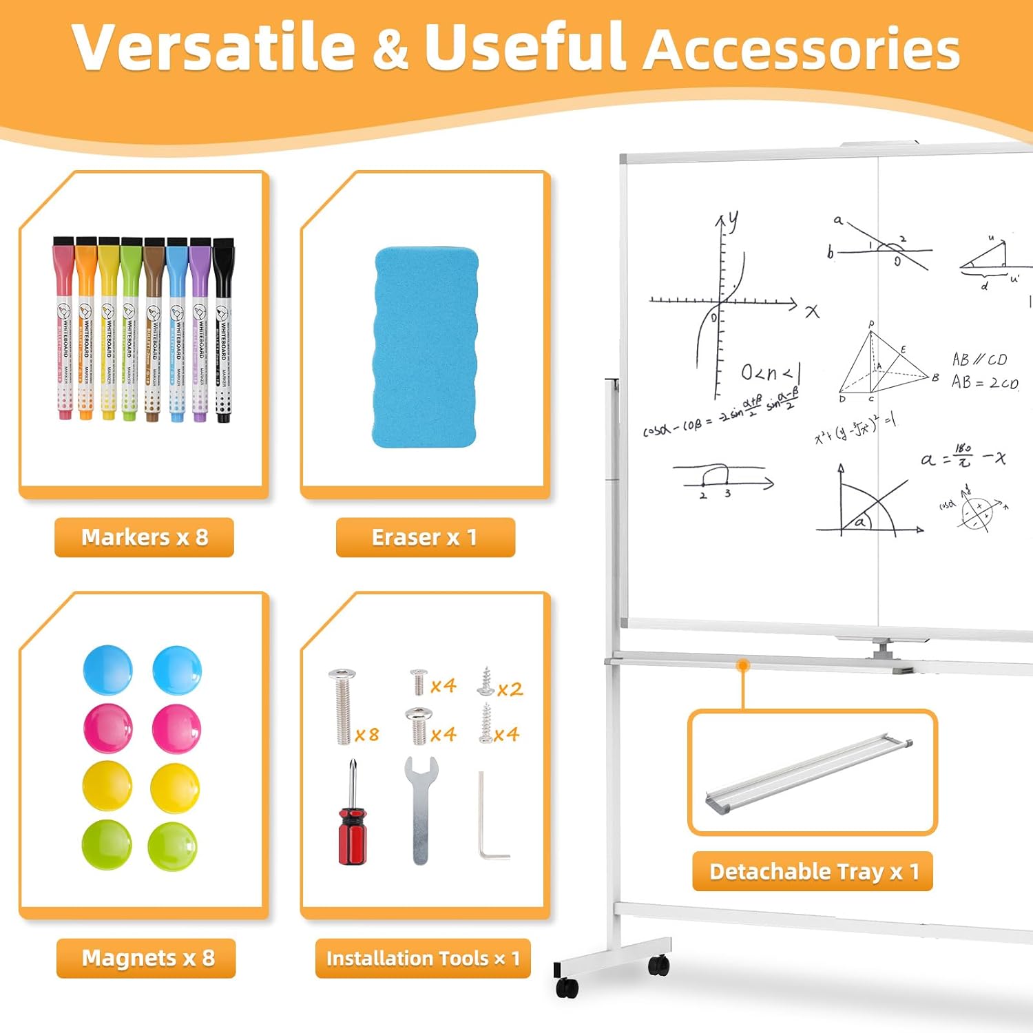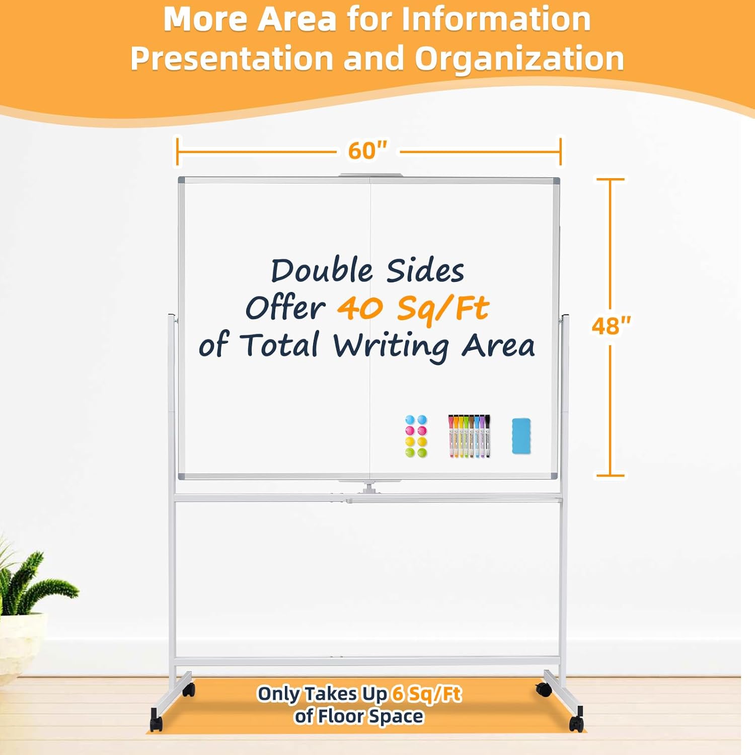 - Flip-and-Write Dual Surface - Measuring 60 x 48 inches, this double-sided whiteboard on wheels provides a spacious 40 sq/ft for capturing ideas, conducting lessons, or giving presentations. One side is perfect for brainstorming inspiration, the other for organizing tasks - easily switch between them with a simple press, bringing order to each day