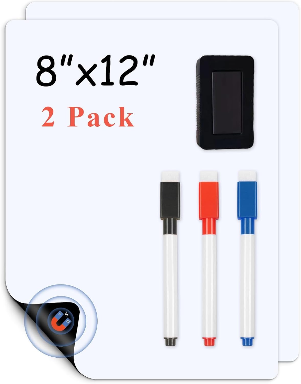 Magnetic Fridge White Board Paper, 8" x 12" 2 Pack Small Dry Erase Board Sheet for Organizer and Planner, Kitchen Refrigerator Whiteboard for Family to-do List, Includes Markers and Eraser