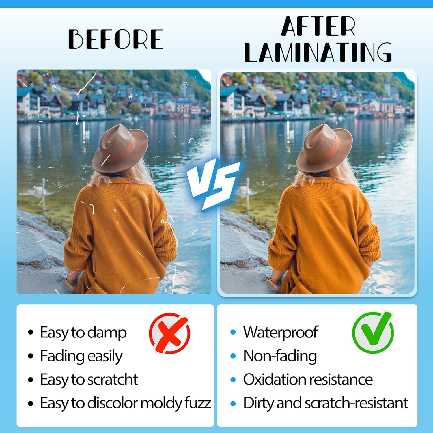 - Excellent Clarity:The laminating sheets only use high-quality adhesive for best transparency to ensure that the photos and documents are clearly visible let important information show through! Round corner design, safe to use