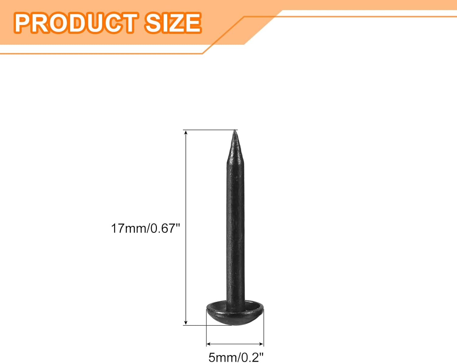 - Specifications: Material: Carbon steel; Color: Black; Diameter of nails head: 5mm/0.2inch; Shank length: 17mm/0.67inch; Package Content: 100Pcs x Upholstery Tacks Nail Pins