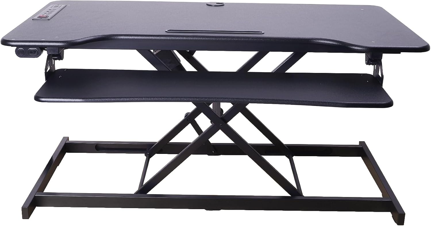 - Extra large electric stand up desk workstation - 46"x23.6" desktop work surface can hold three monitors up to 27" or two monitors up to 34"; 35"x10" keyboard tray can also hold a laptop, plus your mouse while keeping arms in an ergonomic position.
