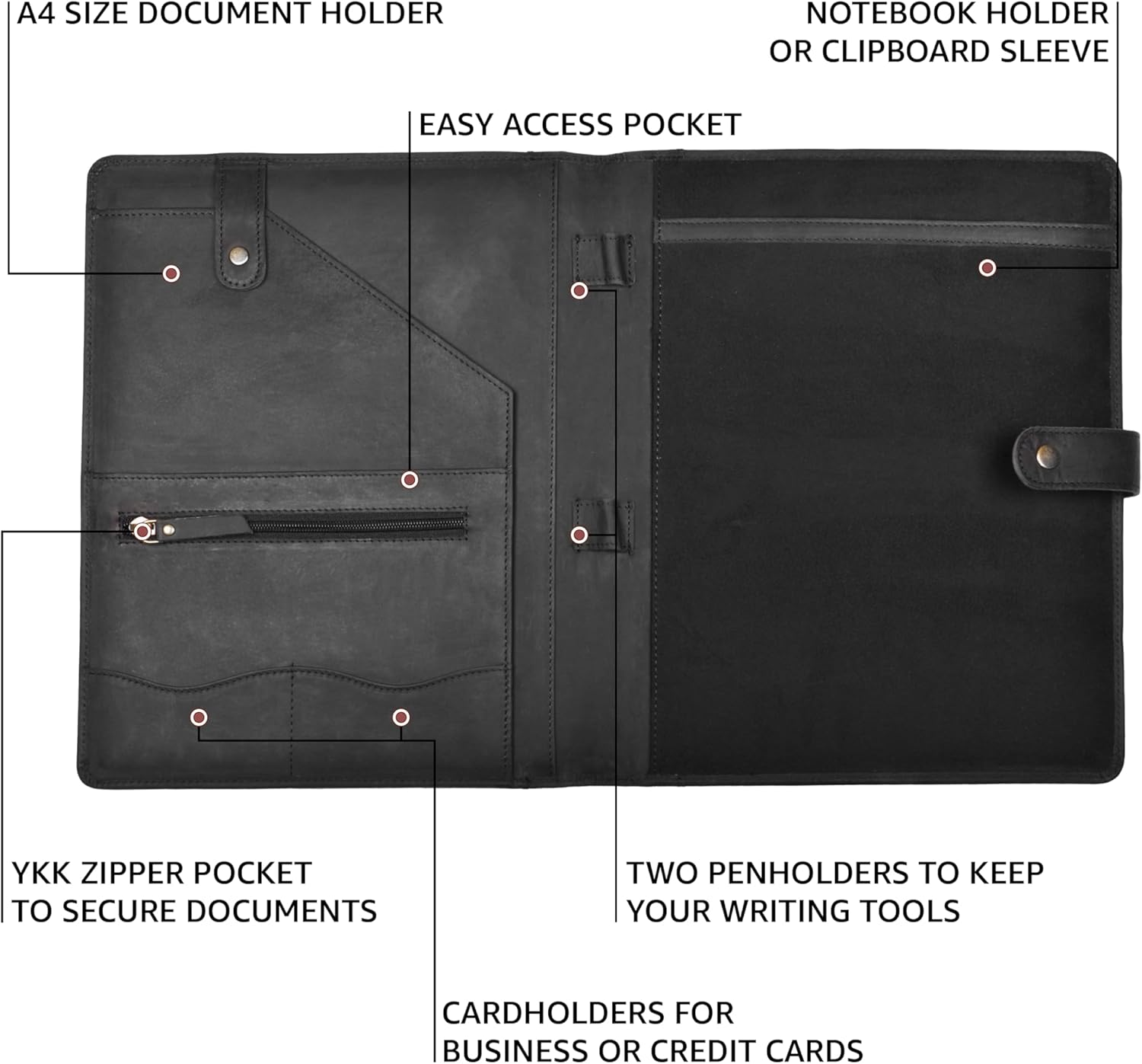 - Unique Full Grain Leather: Crafted from soft and supple black genuine buffalo leather, each padfolio is handmade and unique, ensuring no two are ever the same. The natural distressing and tanning process give it a vintage look that ages beautifully.