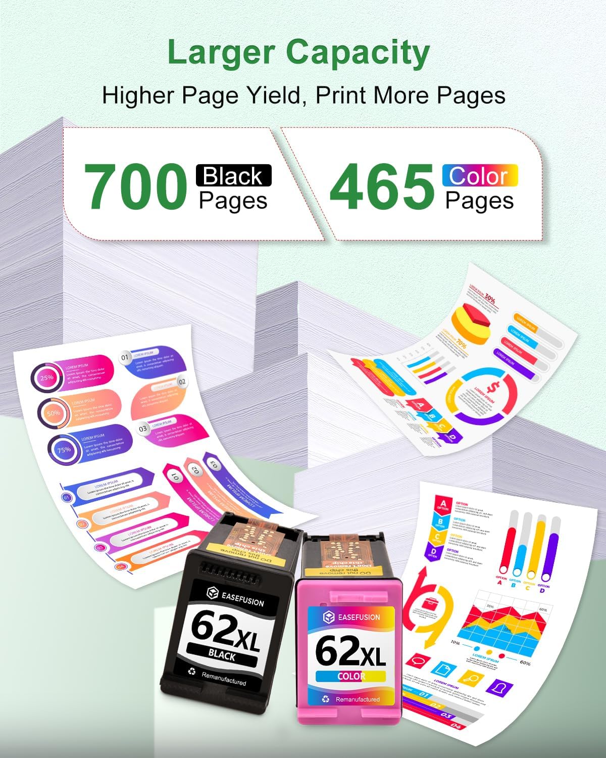 - Impressive Page Yield: With EaseFusion for hp62xl black/tricolor high yield ink cartridge, print more without compromising on quality. Deliver a high yield of 700 pages per 62xl black and 465 pages per 62xl color at 5% coverage on A4 paper. By choosing our replacement for hp 62 ink cartridge combo pack, just enjoy uninterrupted printing