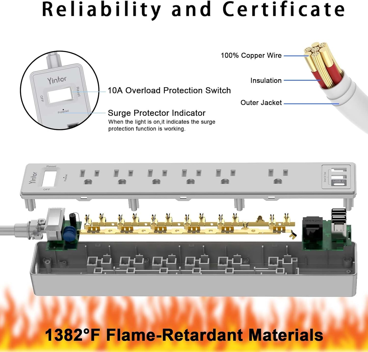 10Ft Power Strip Surge Protector - Yintar Extension Cord with 6 AC Outlets and 3 USB Ports for Home, Office, Dorm Essentials, 1680 Joules, ETL Listed, Grey