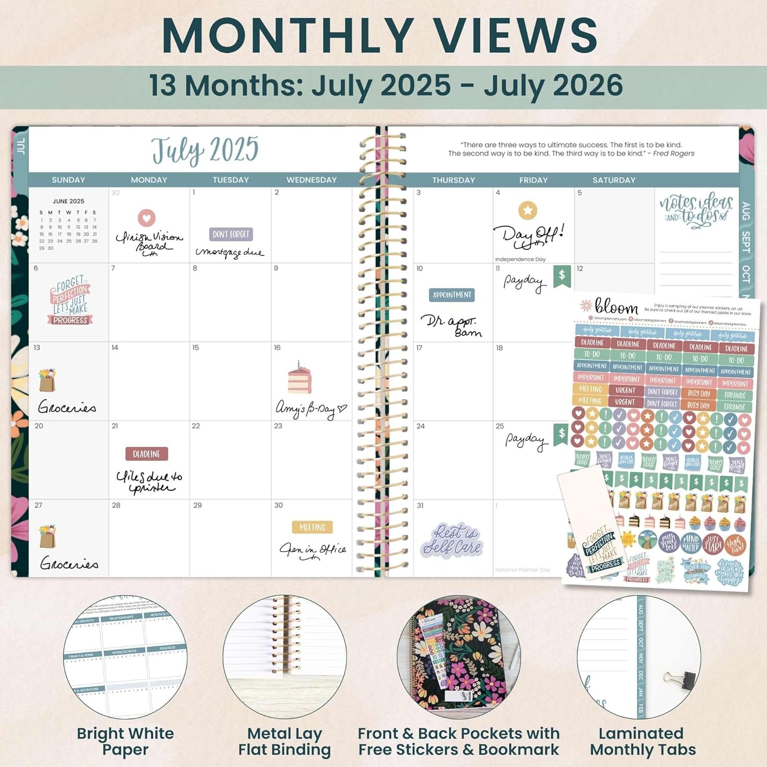 - PREMIUM FEATURES: Soft, lightweight covers made from thick cardstock with gloss film lamination, monthly tabs, deluxe 100gsm bright white bleed-resistant paper, recyclable metal lay-flat spiral binding, vertical front and back inside storage pockets, and FREE magnetic bookmark and stickers now included!