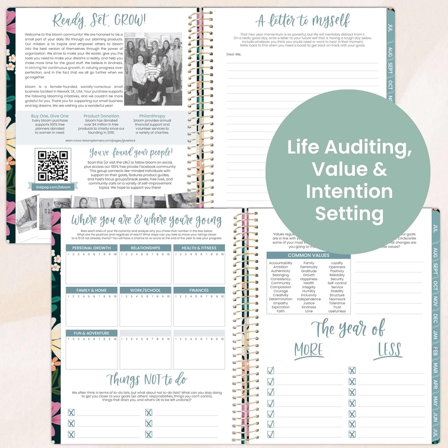 - BONUS ELEMENTS: Packed with life coaching worksheets and inspirational features to help you set and achieve all of your goals for the year: personal mission statement prompt and yearly goal setting page, weekly scheduling template, values page, habit tracking, vision board, monthly spending log, 13 notes pages, inspirational quotes, monthly challenges, and more!