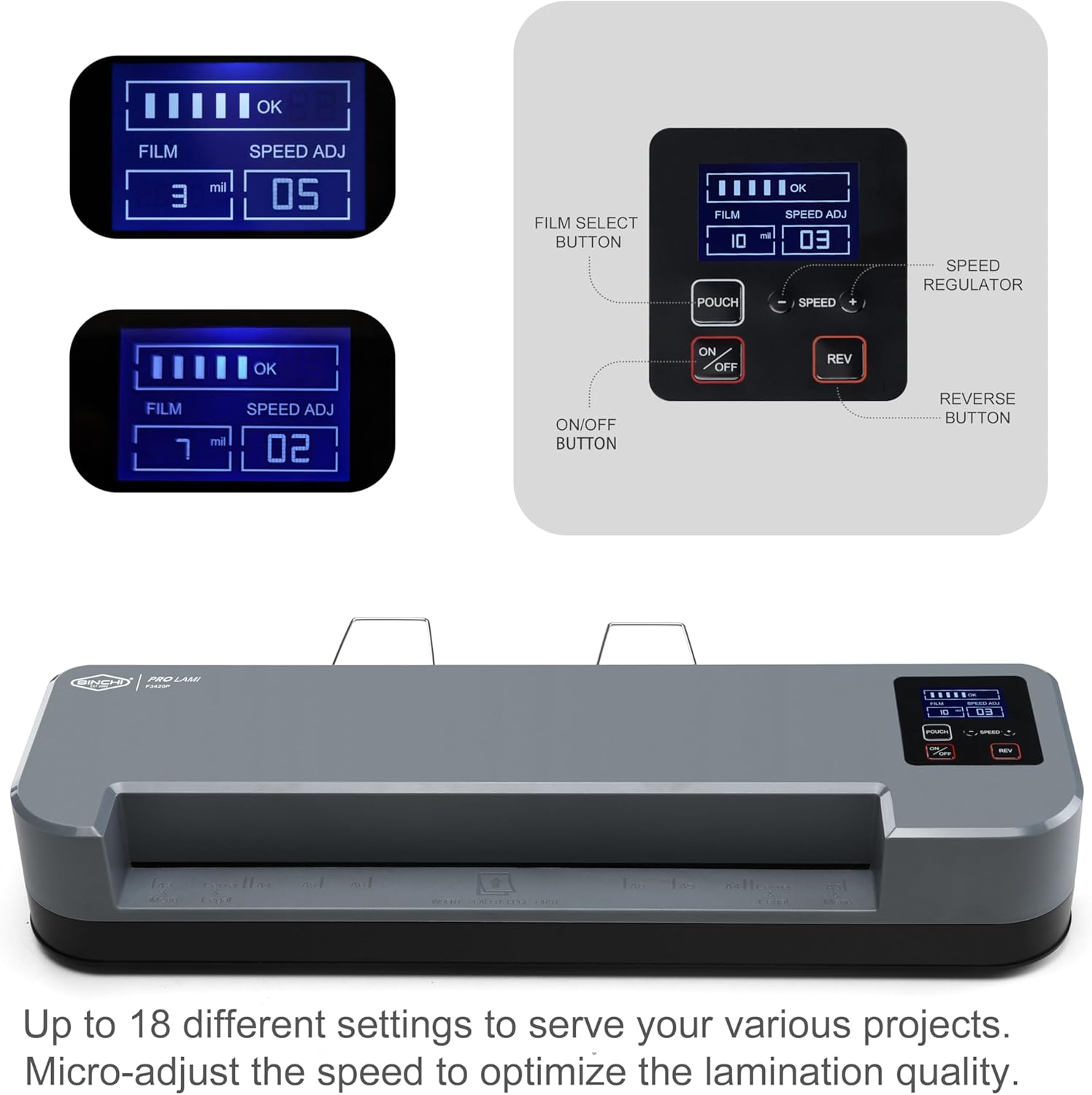 - 【User-Friendly LCD Control Panel】Easily choose settings based on pouch thickness and lamination results using the intuitive LCD display. With up to 18 adjustable modes, it provides maximum flexibility to achieve optimal laminating results across different paper types and colors.