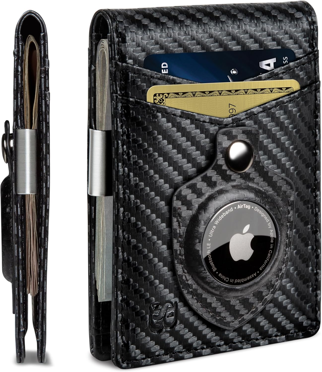 - Minimalist Airtag Wallet - Beautifully crafted from full grain leather, it sports a minimalist design for men who want a slim leather wallet without sacrificing functionality. The thin wallet is designed to fit directly in the pocket for easy carrying. Total of 11 available card slots with an innovative stainless- steel money clip. Wallet Size: 4.3 inches x 3.1 inches
