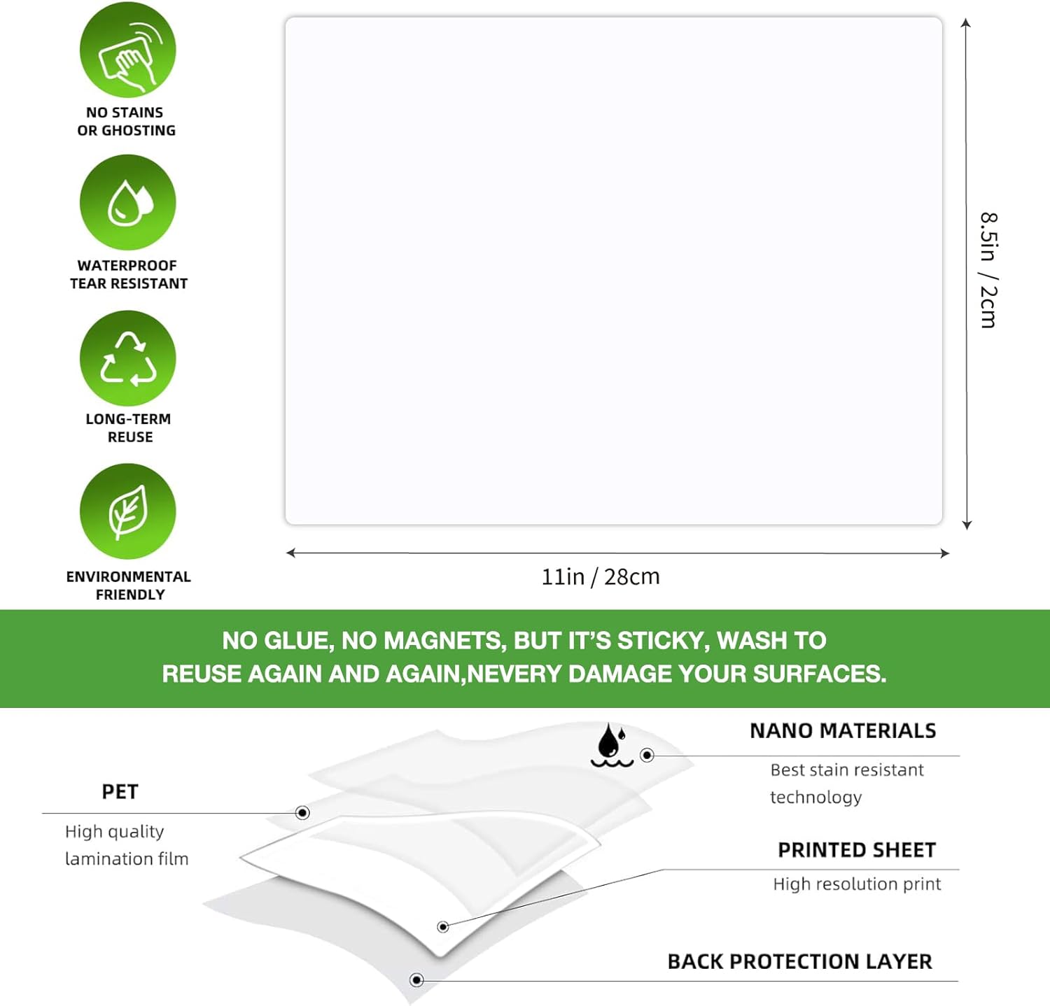 - The Dry Erase Board stick firmly but will peel away cleanly and easily when needed, each board can be use up 10,000 times, just wash to renew if get dirty or stickless