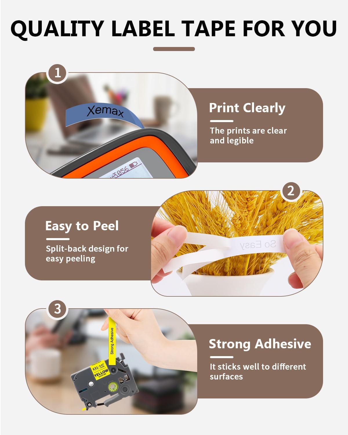 - Package Include: 6-Pack Multi-Color Tze 12mm 0.47" Label Tape for Brother Label Tape Tze-131 Tze-231 Tze-431 Tze-531 Tze-631 Tze-731 (Black on Clear/White/Red/Blue/Yellow/Green)