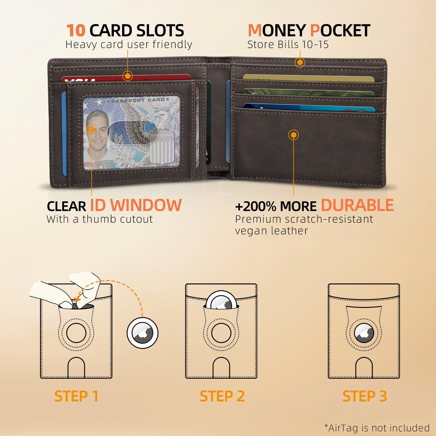 - NO MONEY CLIP DESIGN - Measuring 4" x 3.5", this slim men's wallet boasts a bill compartment that occupies less space than a metal money clip, effectively reducing bulk. It includes 11 card slots, featuring a quick-access slot on the front, 10 slots on the wallet sleeves, and 1 integrated AirTag pocket. (AirTag is not included)