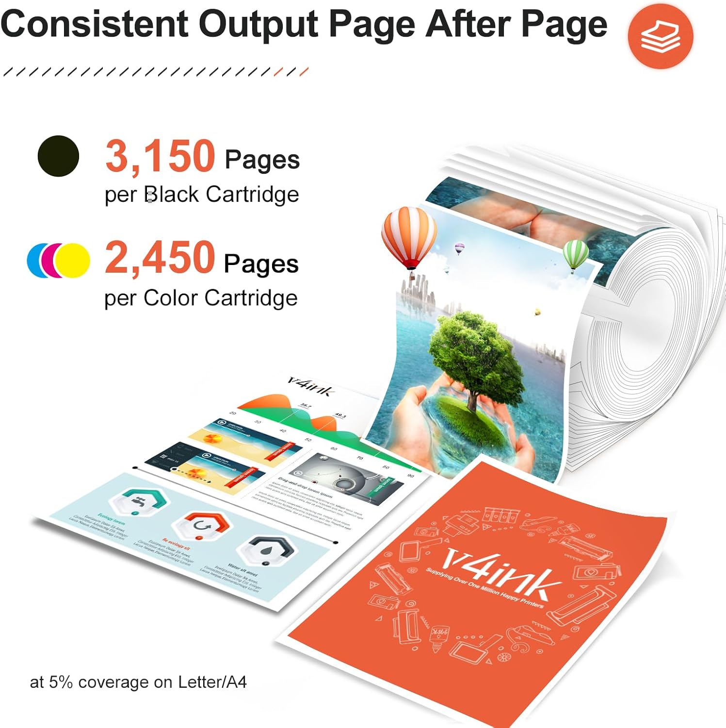 - Print more and cost less: 3,150 pages per Black cartridge and 2,450 pages per Cyan Yellow Magenta Cartridge at 5% coverage (Letter/A4).