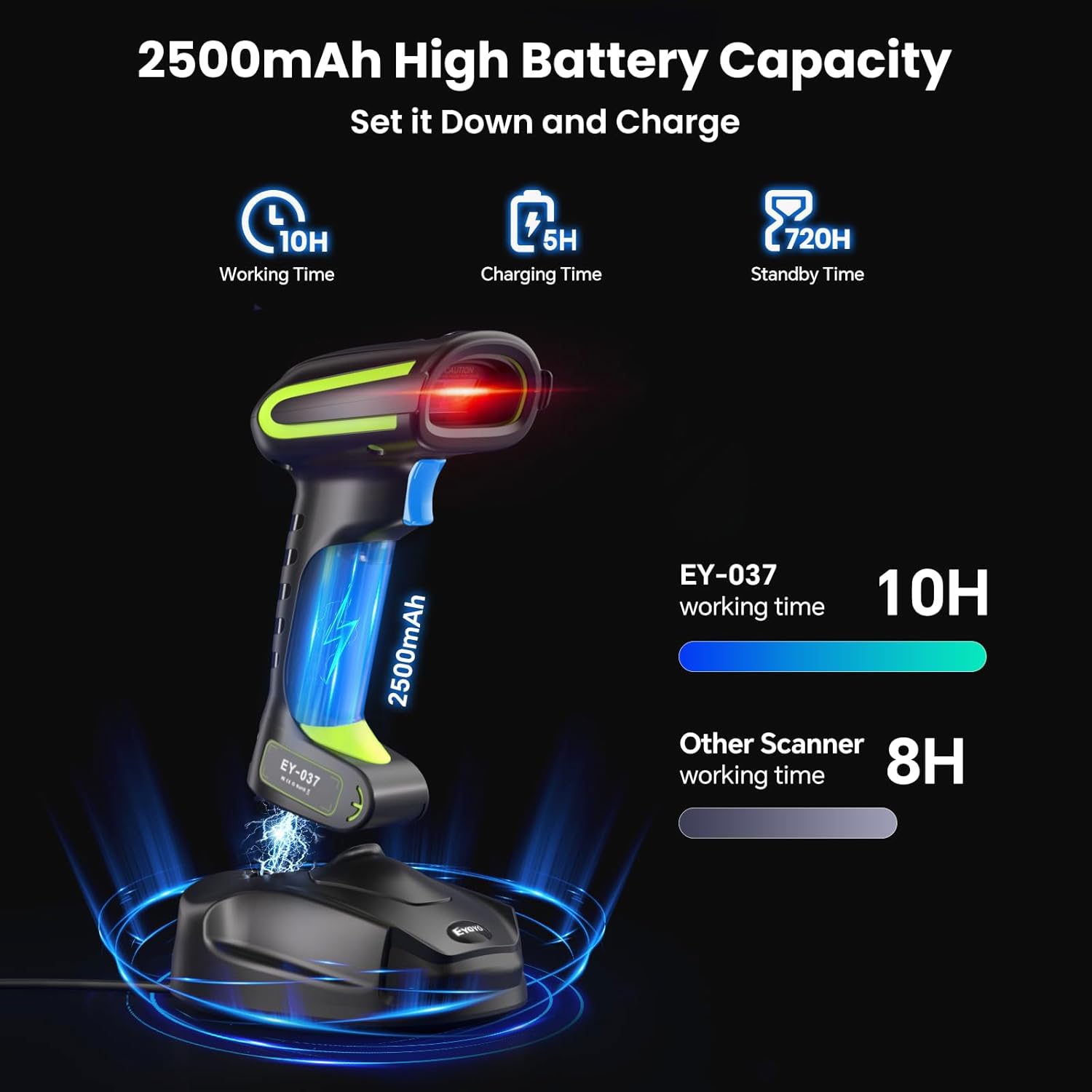 - Automatic Scanning & Storage Mode: The EY-037 1D 2D QR Bluetooth barcode scanner offers three scanning modes: manual trigger, continuous scanning, and auto-sensing, providing flexibility for both hands-free and handheld operation. It also features a storage mode, allowing you to store up to 100,000 barcodes when out of Bluetooth or wireless range. For optimal use, please refer to the user manual for detailed instructions