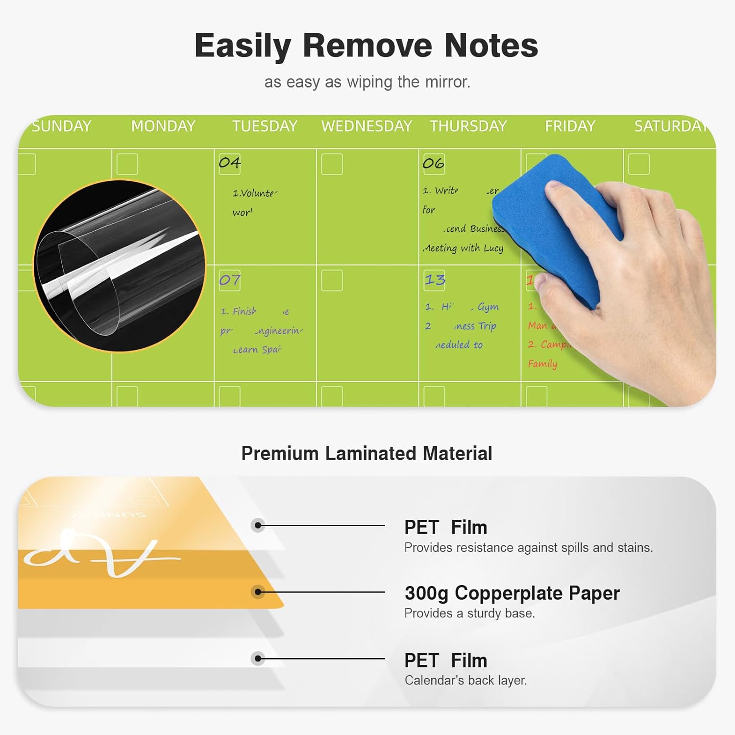 - ✨ Dry Erase Wall Calendar : is made of PET Film and 300 grams Copperplate Paper, providing a durable surface that resists scratches and smudges, while the sturdy Copperplate Paper backing keeps it in place without curling.