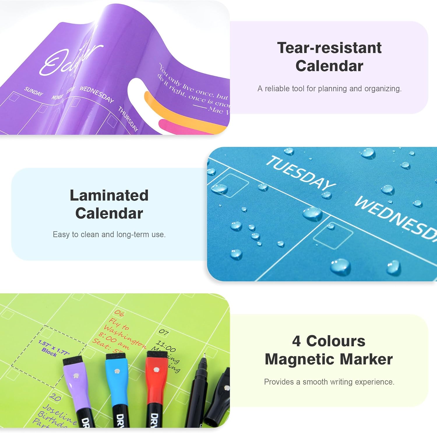 - ✨ Undated Laminated Calendar: This waterproof wall calendar comes with a mini eraser, four dry-erase markers, 50 push pins, and 50 transparent round stickers. The undated monthly calendar can be started at any time, making it perfect for long-term use.