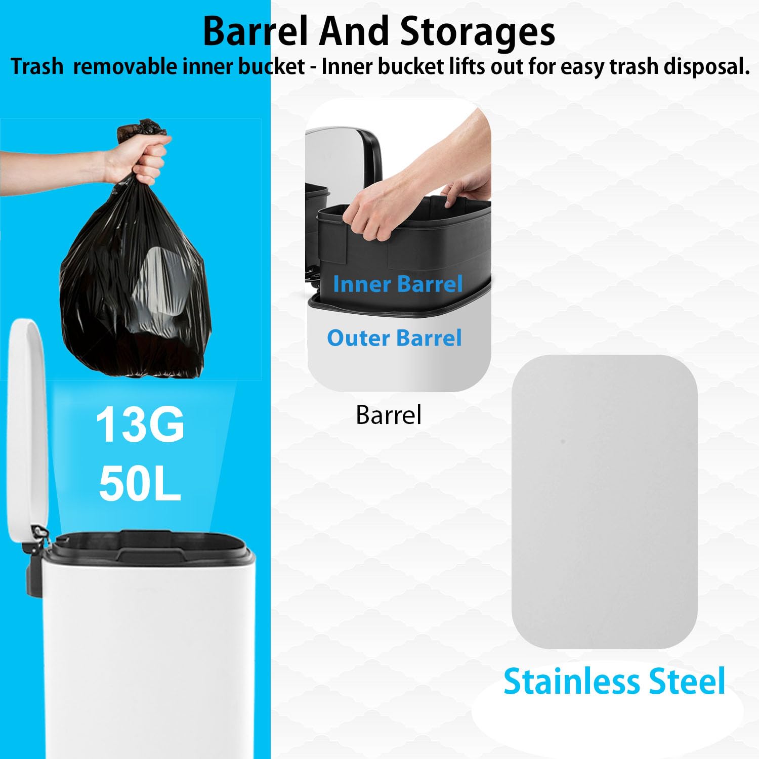 - 13 Gallon Ultra-large Capacity: 13 gallons can absolutely meet your daily use, in the kitchen table next to a kitchen trash can, you will be more convenient to deal with kitchen waste. The regular 13-gallon garbage bag in the supermarket can be used in our stainless steel trash can, and it's kind of you to use a bigger bag. The lid of the garbage can is removable, itβs convenient for you to put in and take out the garbage bag.step trash can kitchen trash can bedroom trash can