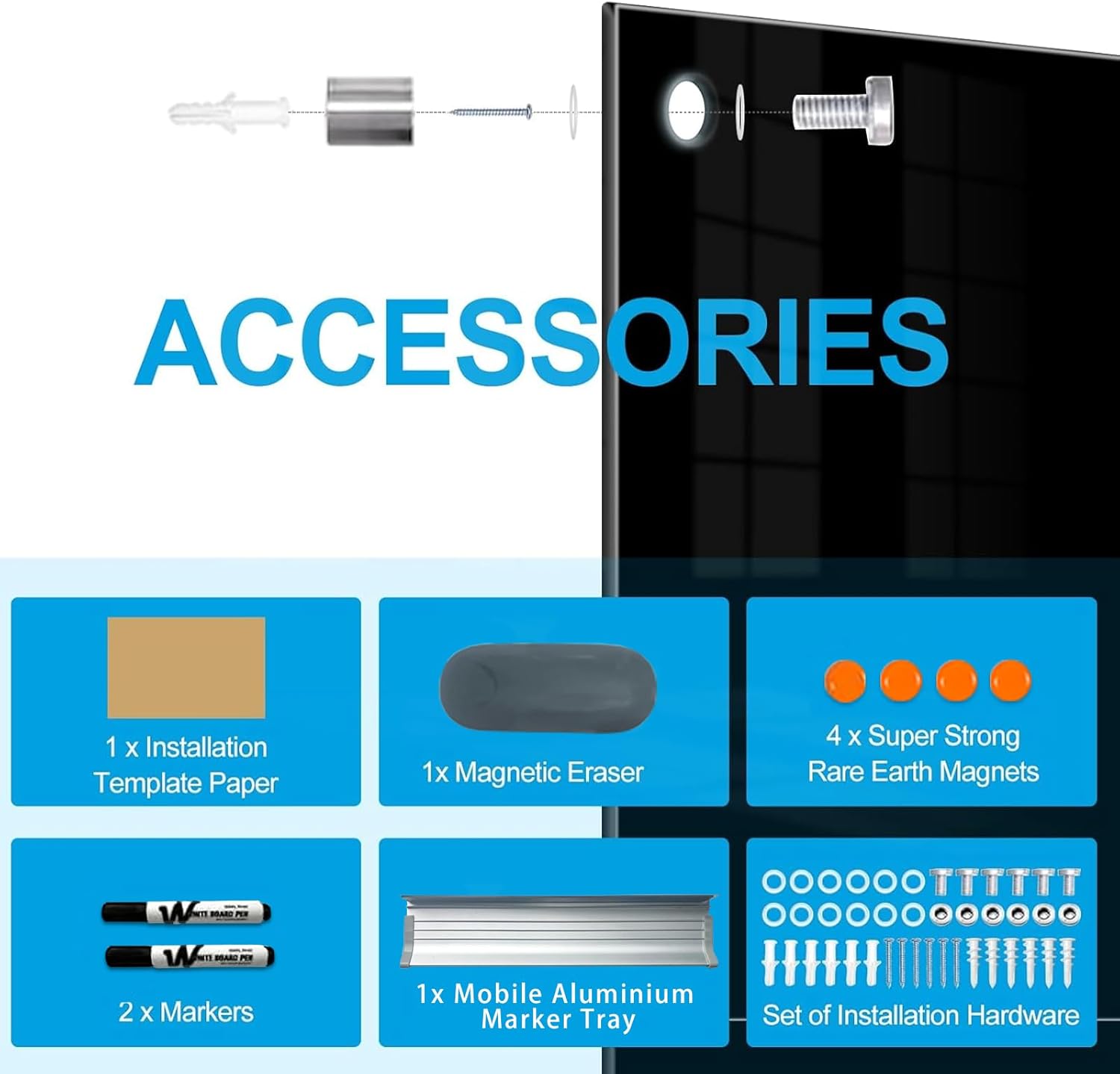 - COMPREHENSIVE ACCESSORIES SET: Comes with one 72" x 48" frameless tempered glass whiteboard, two markers, four magnets, one eraser and one marker tray for mounting. Pay special attention to the magnetism will not be strong due to the thickness of the glass, standard magnets do not work. Please use silvery super strong rare earth magnets. Don't use normal black magnet and fridge magnet.