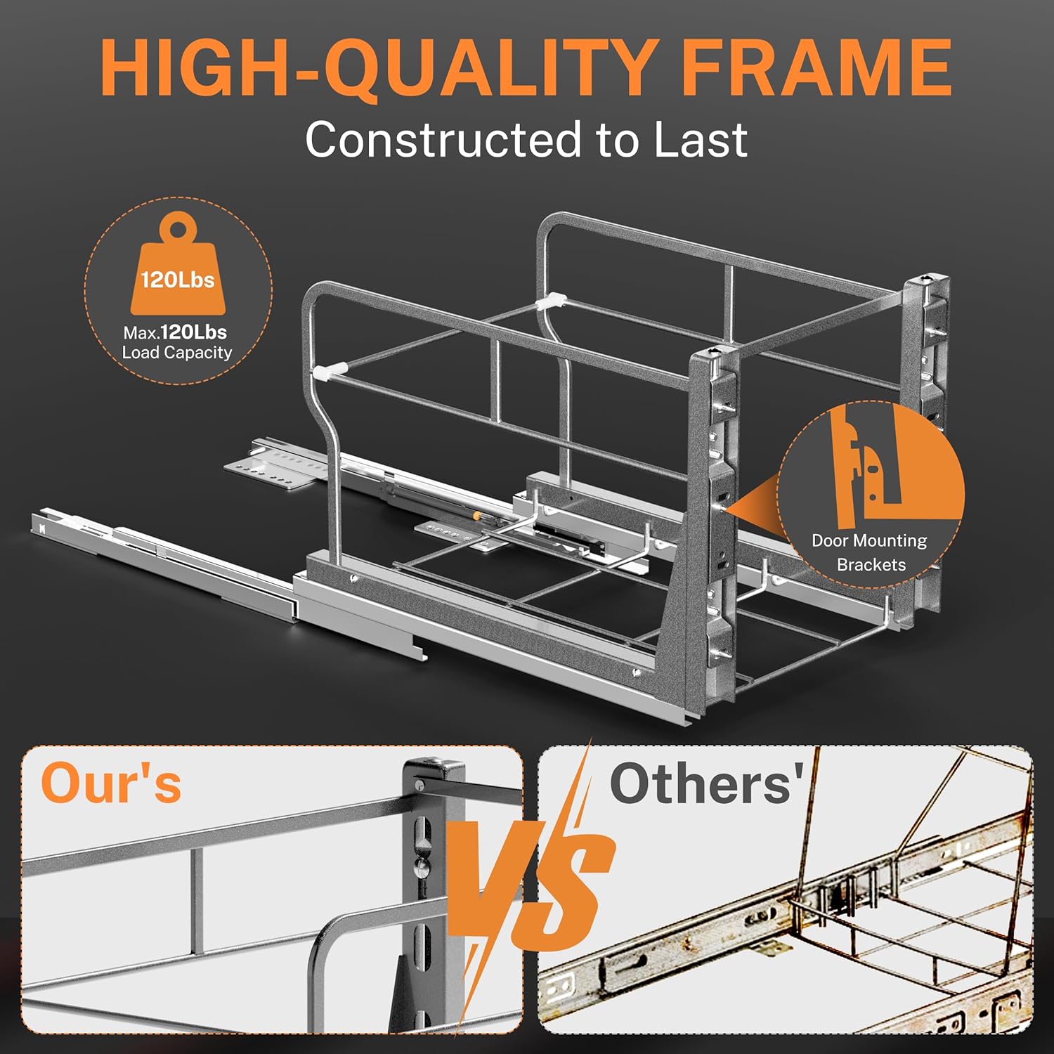 - Premiun Material: Trash can cabinet pull out is made of high-quality carbon steel with powder-coating surface for durability and rust resistance, allowing you to clean it with a cloth. Made for a trash can kitchen of 28 to 40 quarts (7–10 gal, 26–37 l) in volume, the frame can carry 120 pounds, 60 pounds more than regular slides.