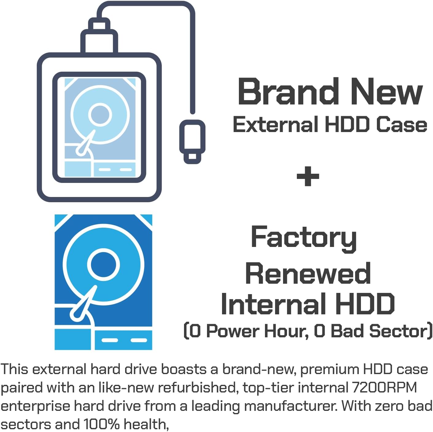 - This external hard drive boasts a brand-new, premium HDD case paired with a excellent refurbished, top-tier internal 7200RPM enterprise hard drive from a leading manufacturer. With zero bad sectors and 100% health, it has passed rigorous factory quality tests to ensure exceptional performance and reliability. Fully researched and tested for outstanding performance and compatibility with PC & gaming consoles, it stands as the top choice in external hard drives.