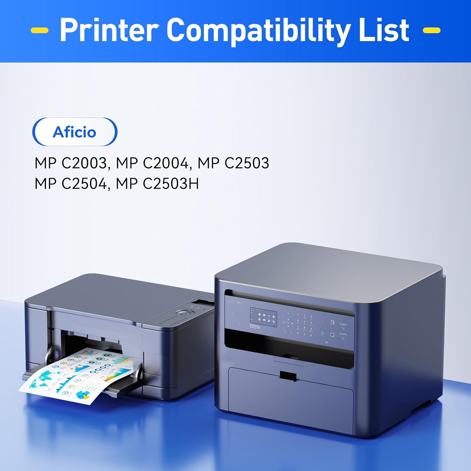 - Compatible Printers: Compatible with Ricoh Aficio MP C2003/MP C2503/MP C2004/MP C2004ex/MP C2504/MP C2504ex, Ricoh Lanier MP C2003/MP C2503/MP C2004/MP C2004ex/MP C2504/MP C2504ex, Ricoh Savin MP C2003/MP C2503/MP C2004/MP C2004ex/MP C2504/MP C2504ex, Ricoh MP C2011 MP Series Printer. Compatible Toner Model:841918,841921,841920,841919.