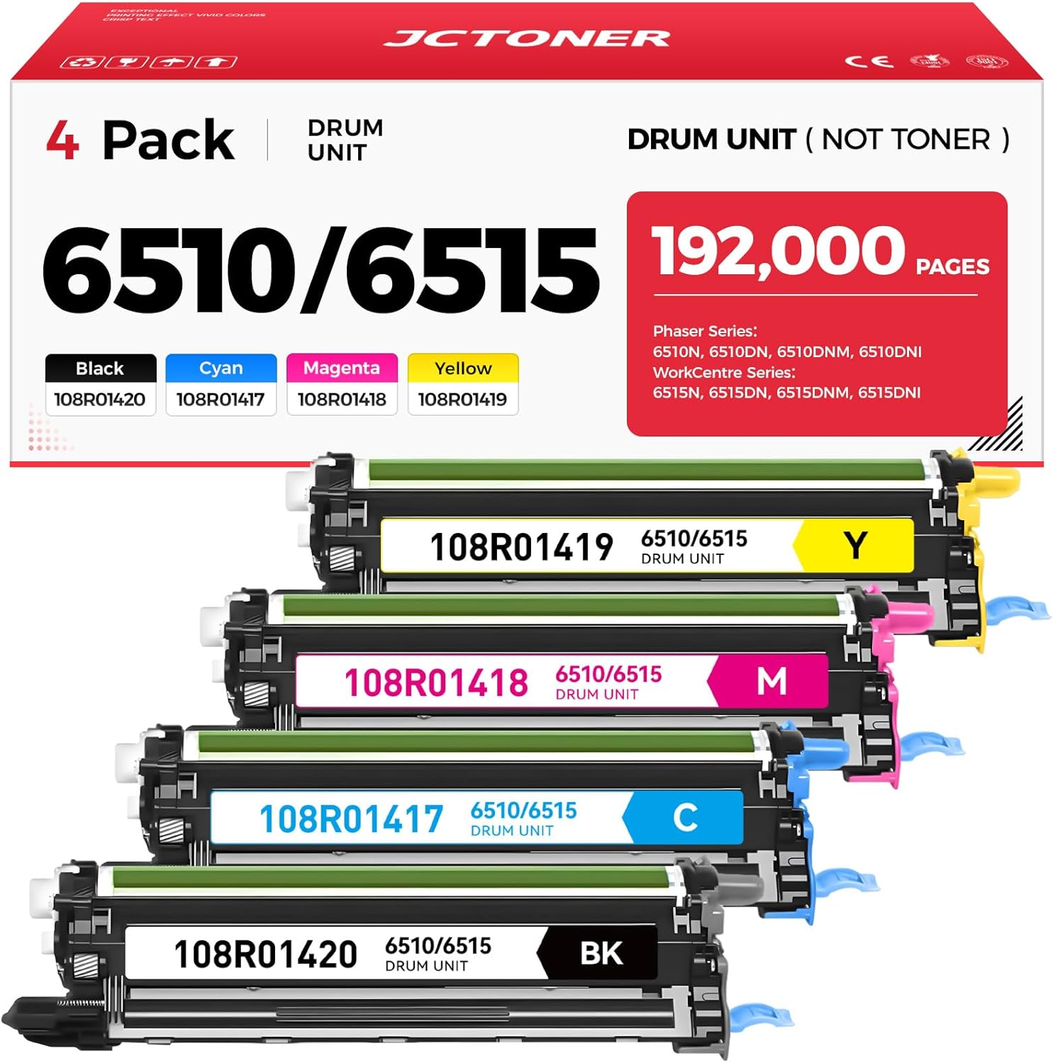 - Package Contents: Total 4 pack 6510/6515 Drum 1*Black / 1*Cyan / 1*Magenta / 1*Yellow (108R01420 108R01417 108R01418 108R01419).