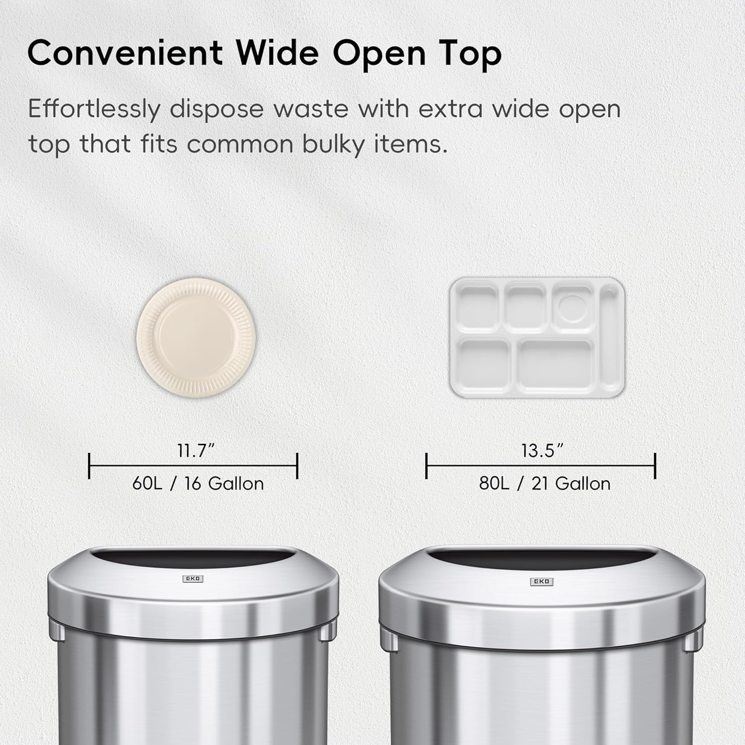 EKO Urban 21 Gallon Semi-Round Open Top Waste Bin, Stainless Steel Half Round Commercial Trash Can for Indoor and Outdoor, Extra Large Metal Garbage Bin for Home, Office, Restaurant, Restroom, 80L