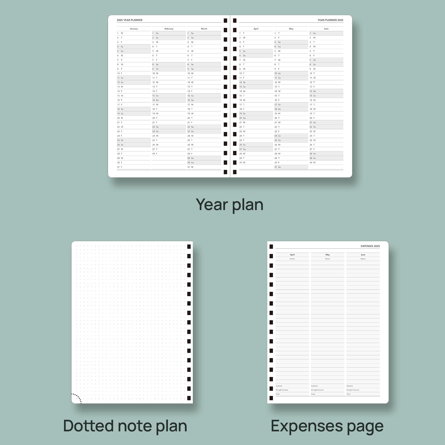 - EXTRA FUNCTION PAGES - Includes a 2025-2026 Yearly Overview, Holiday & Calendar, Monthly Expenses, Contact & Password pages, and 7 dotted notes pages for detailed jotting.