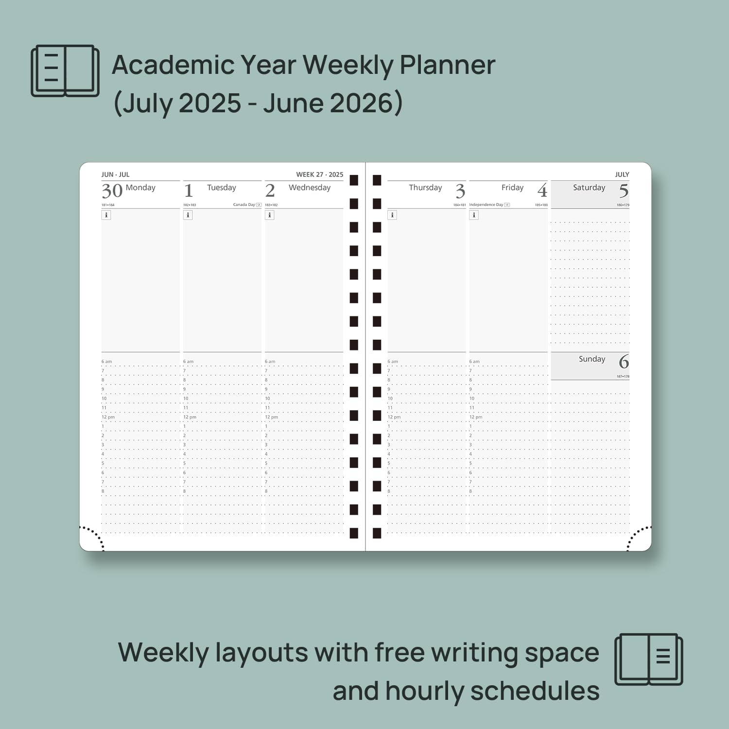 - WEEKLY CALENDAR 2025-2026: Our 6.25'' x 8.5'' Weekly Planner covers from July 2025 to June 2026, giving you the flexibility to start your planning at any point during the academic year. Featuring 2 Vertical Pages per week with Hourly Time Slots from 6 AM to 8 PM.