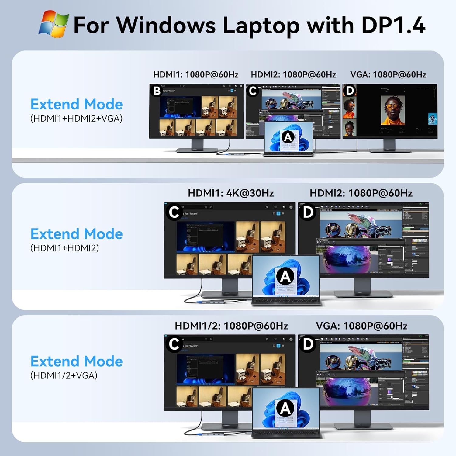 - Docking Station 3 Monitors with Ultra High-definition 4K Output: usb c hdmi hub for multiple monitors adapter with dual HDMI ports and VGA outputs. While single use HDMI port resolution up to 4K@30Hz, single use VGA up to 1080P@60Hz. Dual monitors will be 4K@30Hz and 1080P@60Hz(DP1.4). Triple monitors will be 3*1080P(DP1.4). When dp1.2, one monitor of the resolution will less than 1080P. Note:The computer docking station Not Support Using Converter