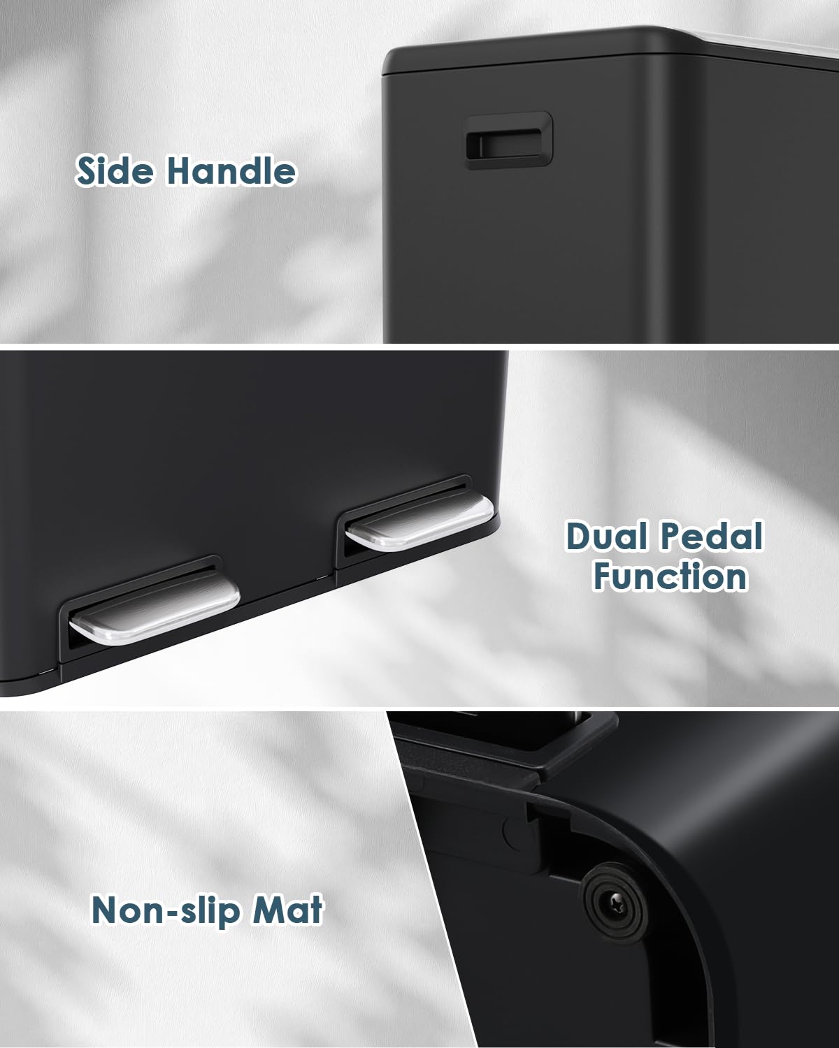- Dual 8 gallon Compartment Bins: Trash can measures 20.3in * 14.6in * 26.2in. With a large capacity of 60 liters, it offers plenty of room for garbage and recycling, Combo garbage bin comes with two removable inner barrels, and each compartment has an independent lid and a widened pedal, which effectively isolates the smell of garbage and facilitates the opening of each compartment.
