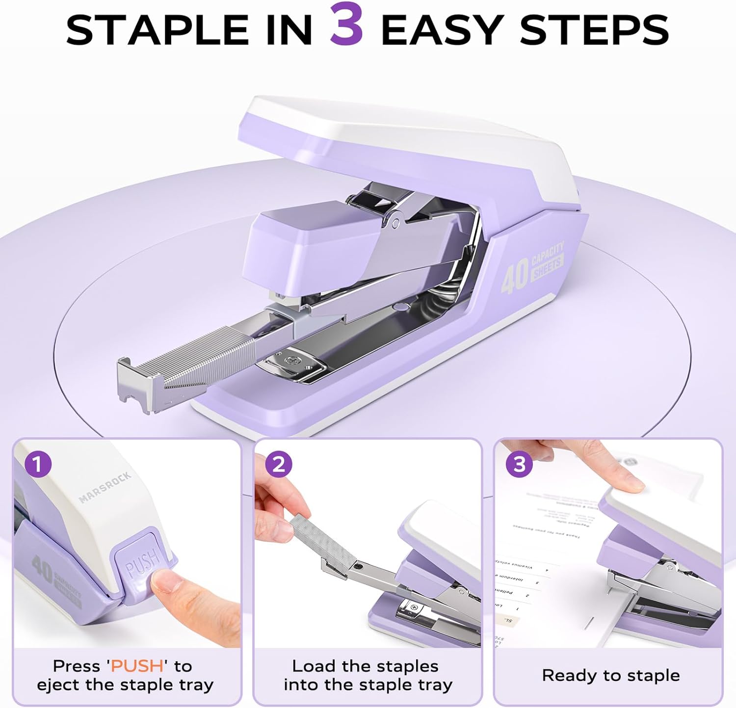 Effortless Stapler for Desk with 40-50 Sheet Capacity, 2000 Staples, 1-Touch Stapling, Ergonomic & Easy to Load Desktop Staplers, Heavy Duty Stapler, and Magnetic Staple Remover, Purple
