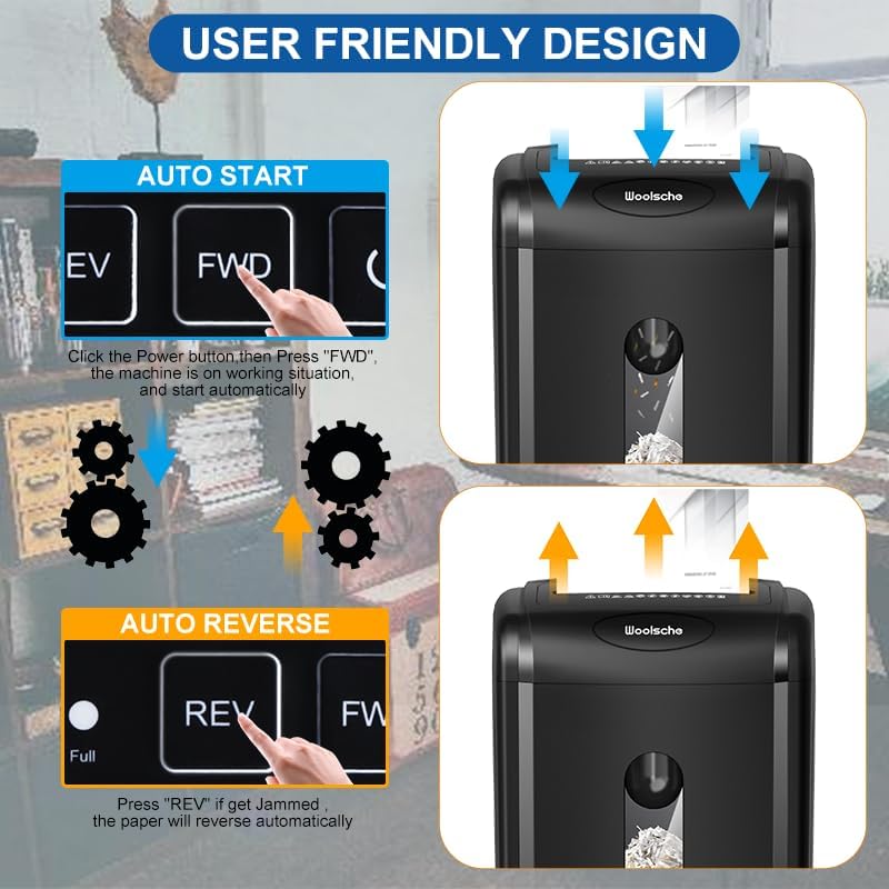 - 【Convinient Design &15 Minutes Shredding】With 15 minutes Non-Stop Shedding,overload operation of the Home shredder machine will Auto start overheating protection with 45 munites cooling time. It include 3-mode control switches (FWD,Power and Auto reverse functions simplify shredding and paper jammed clearing processes