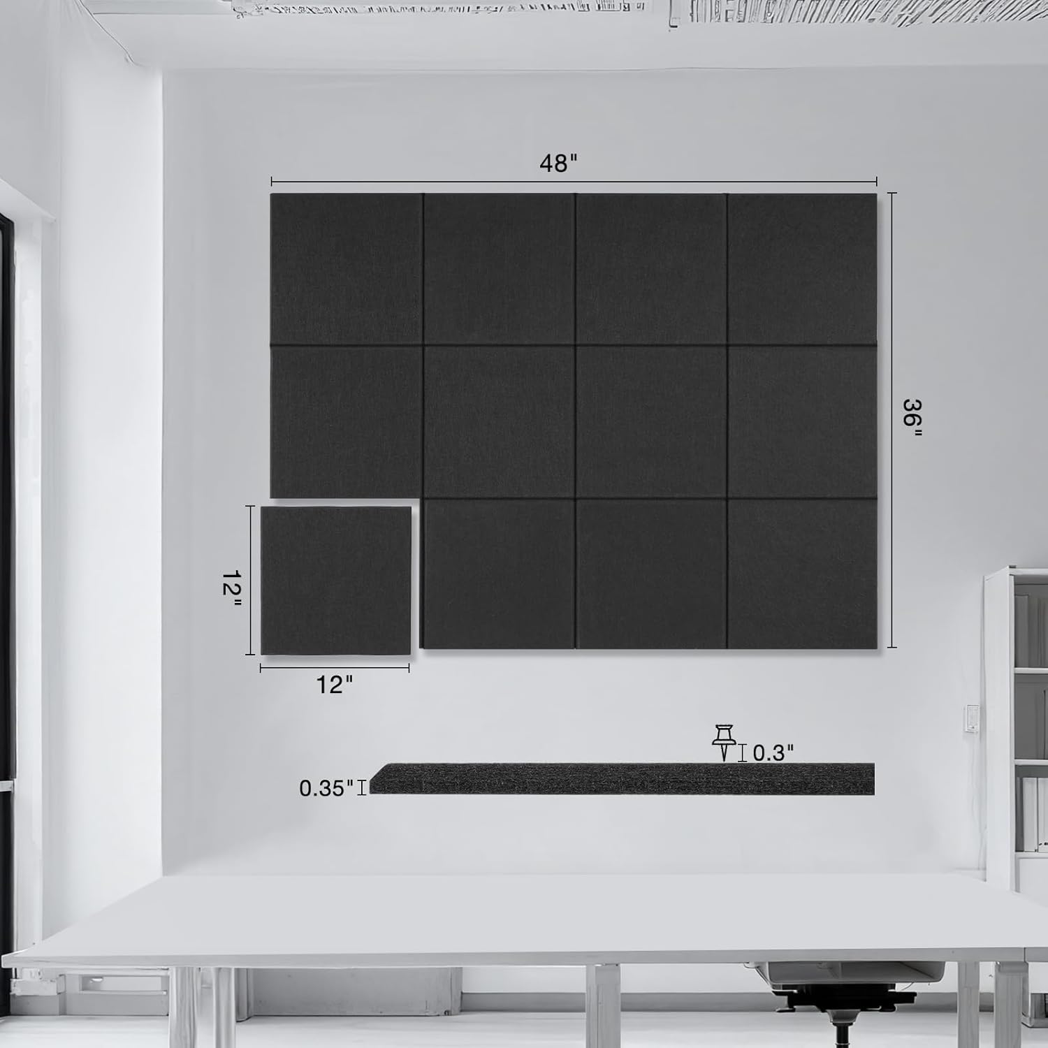- The package contains 12 pieces of wall cork boards, 12 inches long, 12 inches wide, and 0.35 inches thick, including 72 removable safety stickers (can be removed and installed repeatedly), and 30 0.3-inch pushpins. The pushpins will not pierce the bulletin board, protecting the wall and safe to use.
