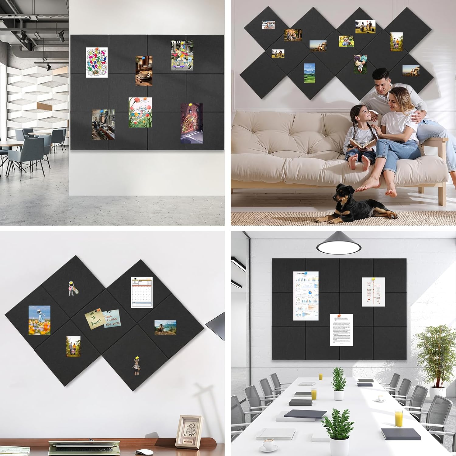 - High-quality and novel felt wall tiles replace traditional cork boards. They are moisture-proof and not easy to change color or mold. They are suitable for office decoration, school, and home decoration. They can be used to fix documents, notes, and stickers with thumbtacks. They can be used as poster boards, bulletin boards, and photo walls. Cork boards have noise reduction and sound insulation functions.