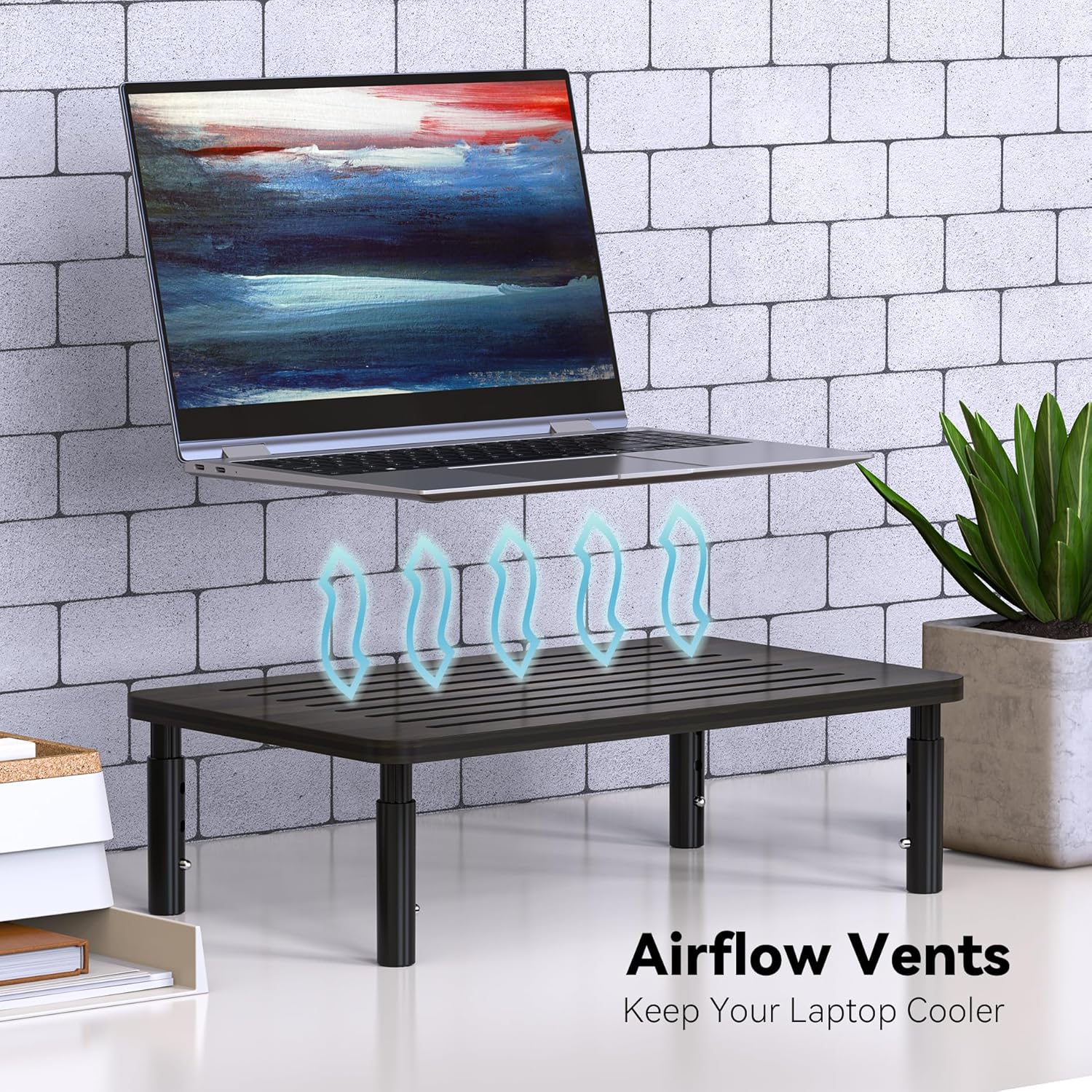 - Effective Heat Dissipation: Our monitor stand is crafted from high-quality bamboo, featuring a ventilated platform to prevent overheating and improve airflow for your electronic devices