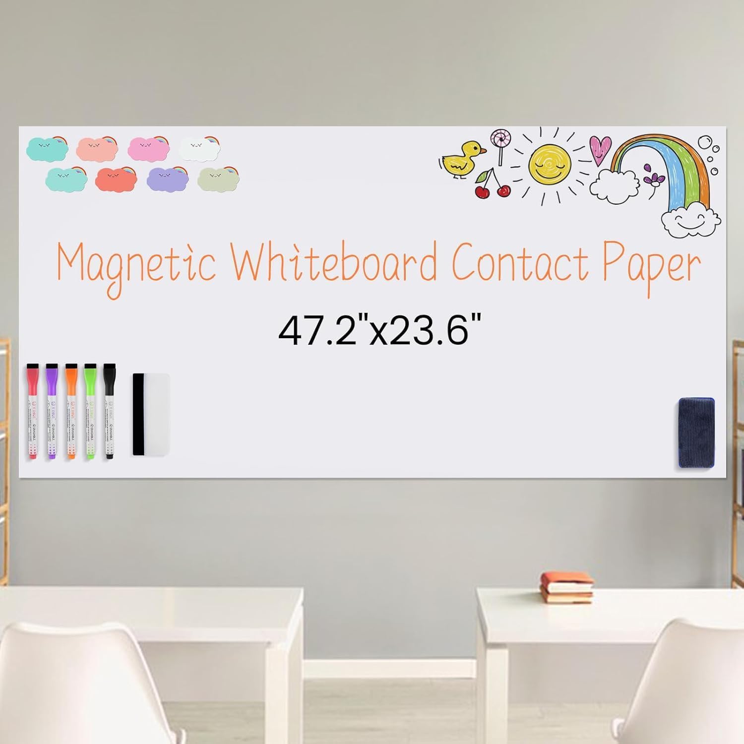 Set of Magnetic whiteboard Contact Paper, Measures 47.2 by 23.6 inches Large, Peel-and-Stick for fridges and Walls, Removable and with Magnetic Labels - Dry Erase White Board