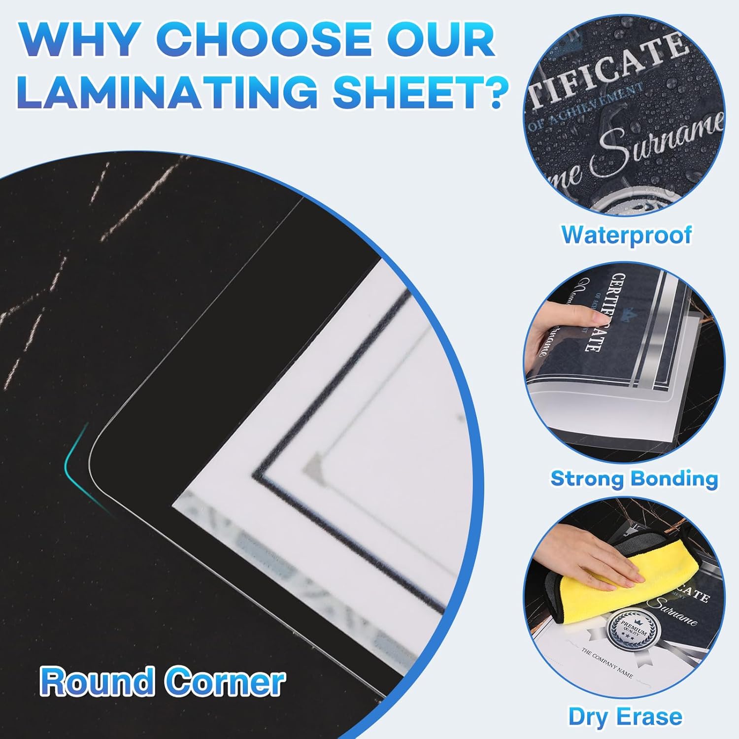 - Clear and Visible Content::In order to achieve optimal transparency and ensure clear visibility of photos and documents, The laminate pouches uses high-quality adhesive, with clear sides and visible content, allowing important information to be reflected. The rounded design makes it safer to use.