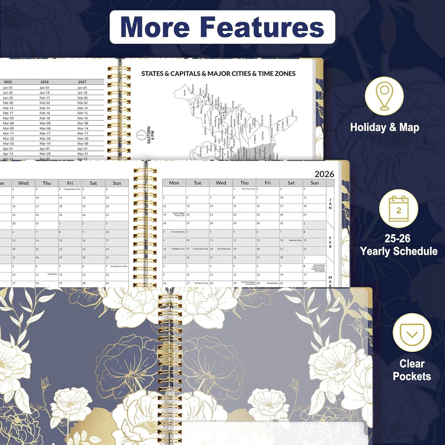 - Monthly View: Each date box provides ample writing space and includes the previous and next month's reference, ruled daily blocks with popular holidays, and Julian Dates for easy long-term project and appointment scheduling.