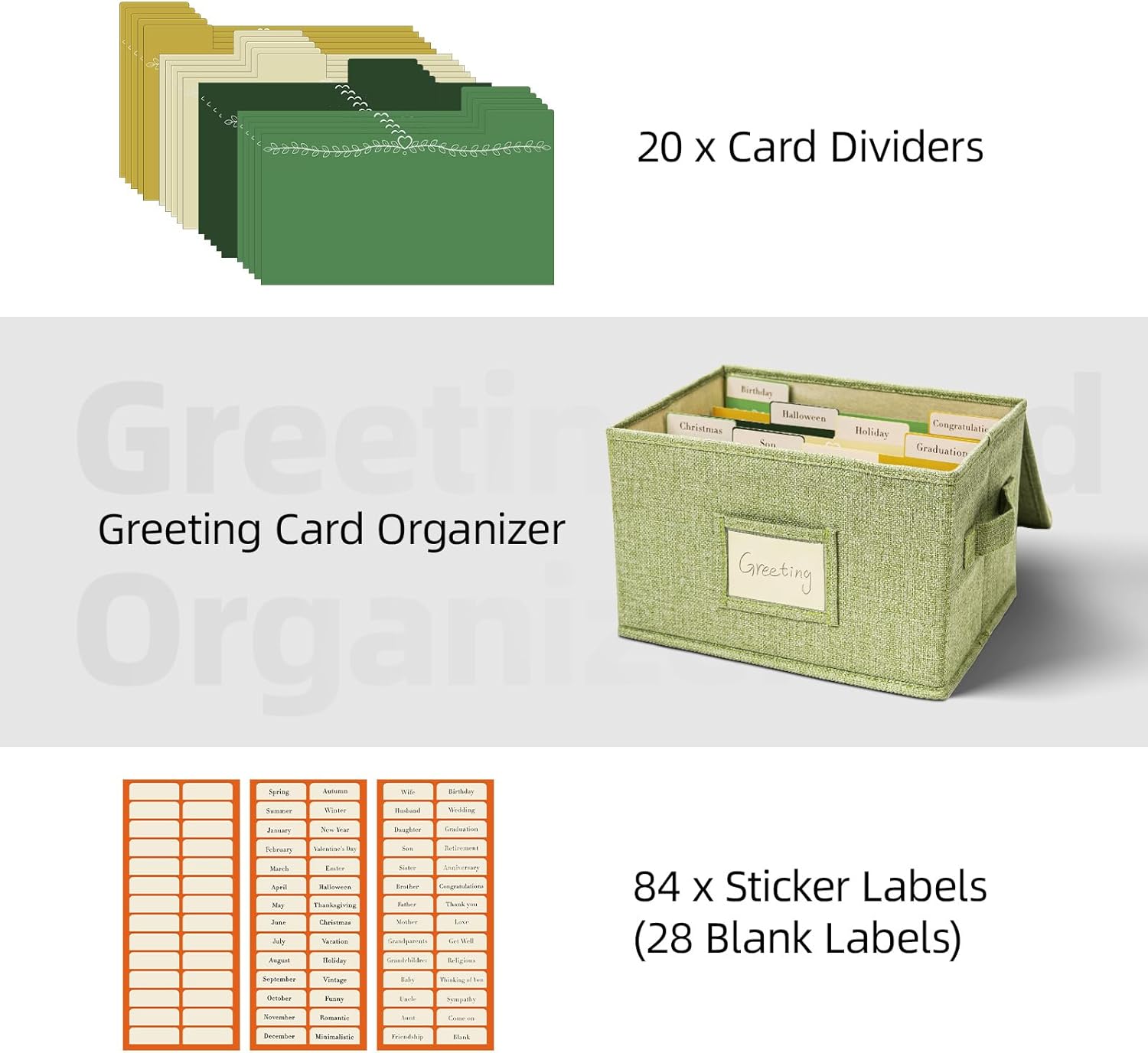 - Make Organizing Easy: The dividers feature double-sided labels for flexible use. You can effortlessly categorize cards by holidays, recipients, and more with the pre-existing labels. Alternatively, the blank stickers allow you to create your own custom categories. This makes it the perfect choice for efficiently storing and sorting cards